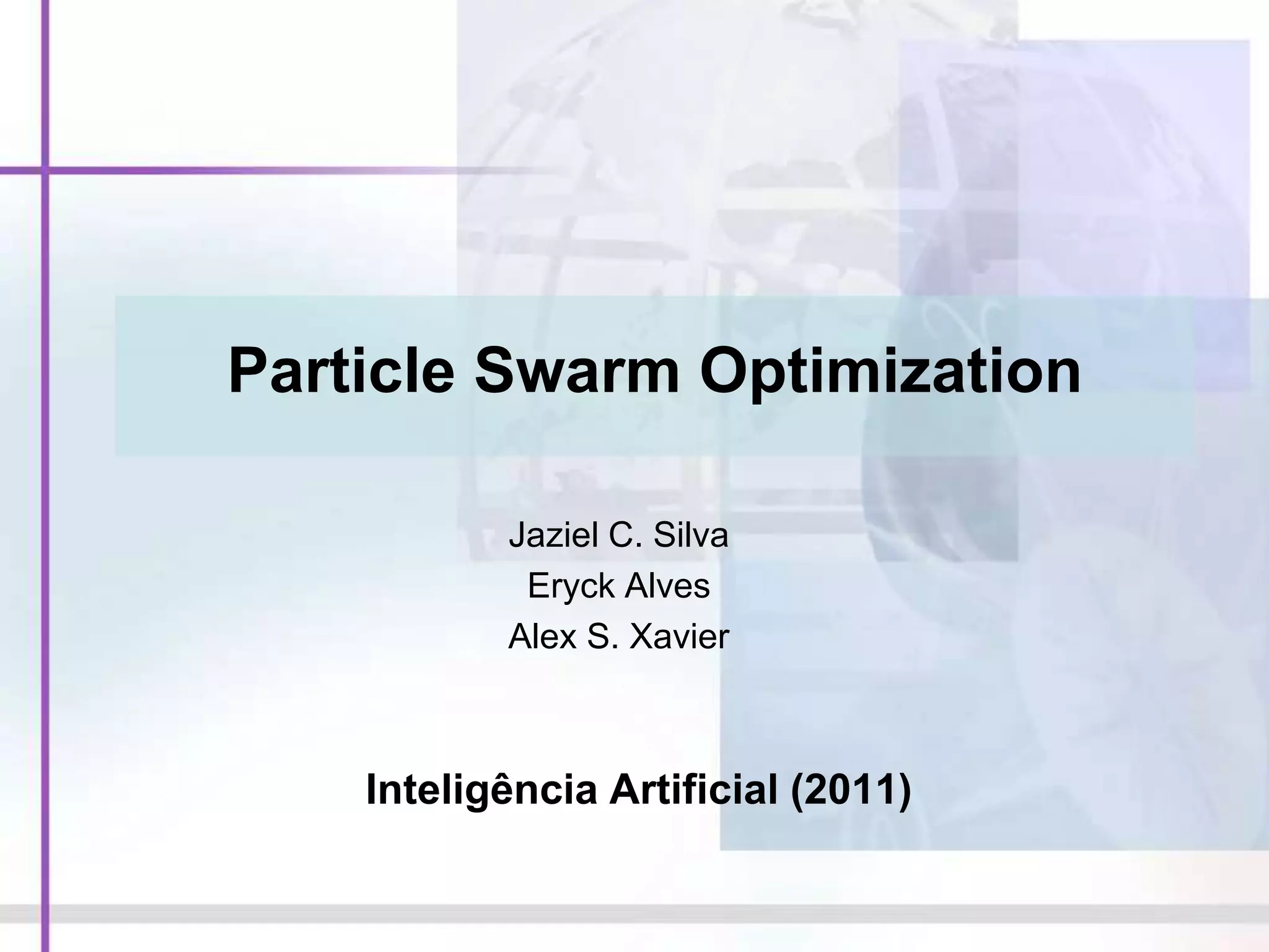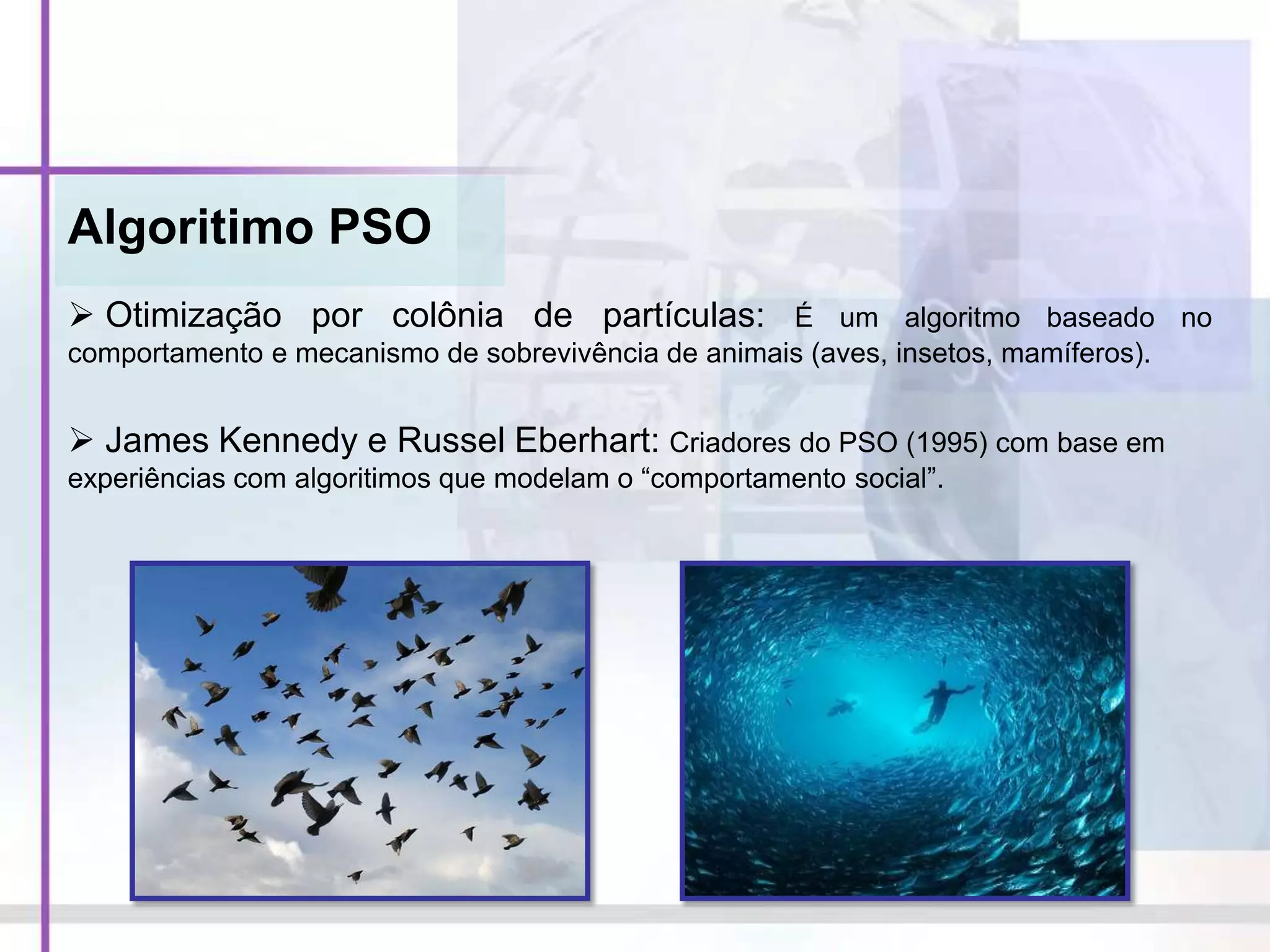 O documento descreve o algoritmo de otimização por enxame de partículas (PSO), apresentando seus conceitos básicos, como vetores de velocidade e posição, e seu funcionamento para resolver problemas de otimização de forma numérica. O PSO foi criado em 1995 por Kennedy e Eberhart e é baseado na teoria de enxames, simulando o comportamento social de animais para encontrar soluções ótimas de forma coletiva.