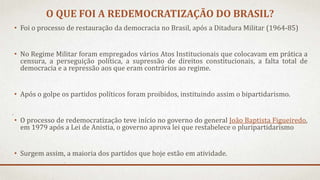 O documento descreve o processo de redemocratização do Brasil após a ditadura militar de 1964-1985. A redemocratização incluiu a restauração da democracia e do pluripartidarismo, com a emergência de novos partidos como o PMDB, PFL e PSDB. O documento também lista e descreve os principais partidos políticos brasileiros, classificando-os como de centro-direita, direita, centro-esquerda ou esquerda.
