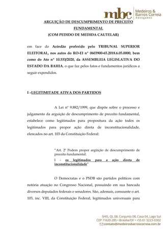 O documento descreve uma arguição de descumprimento de preceito fundamental movida pelos partidos DEM e PSDB contra decisão do Tribunal Superior Eleitoral que alterou critério para contagem de votos de candidato cassado, contrariando resolução própria e jurisprudência, o que violaria princípios da segurança jurídica e da anterioridade eleitoral.