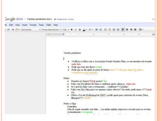Este documento fornece informações sobre ferramentas online para armazenar e compartilhar documentos, apresentações, fotos e vídeos. Ele descreve os principais serviços Scribd, SlideShare e Google Docs e discute suas vantagens, como a capacidade de editar documentos colaborativamente online. O documento também lista os formatos de arquivo suportados por esses serviços.