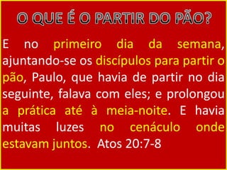 Paulo falou com os discípulos até a meia-noite no primeiro dia da semana enquanto partiam o pão. Ele pregou sobre a graça e a importância da igreja estar unida, separar o que é do reino, e anunciar o evangelho.