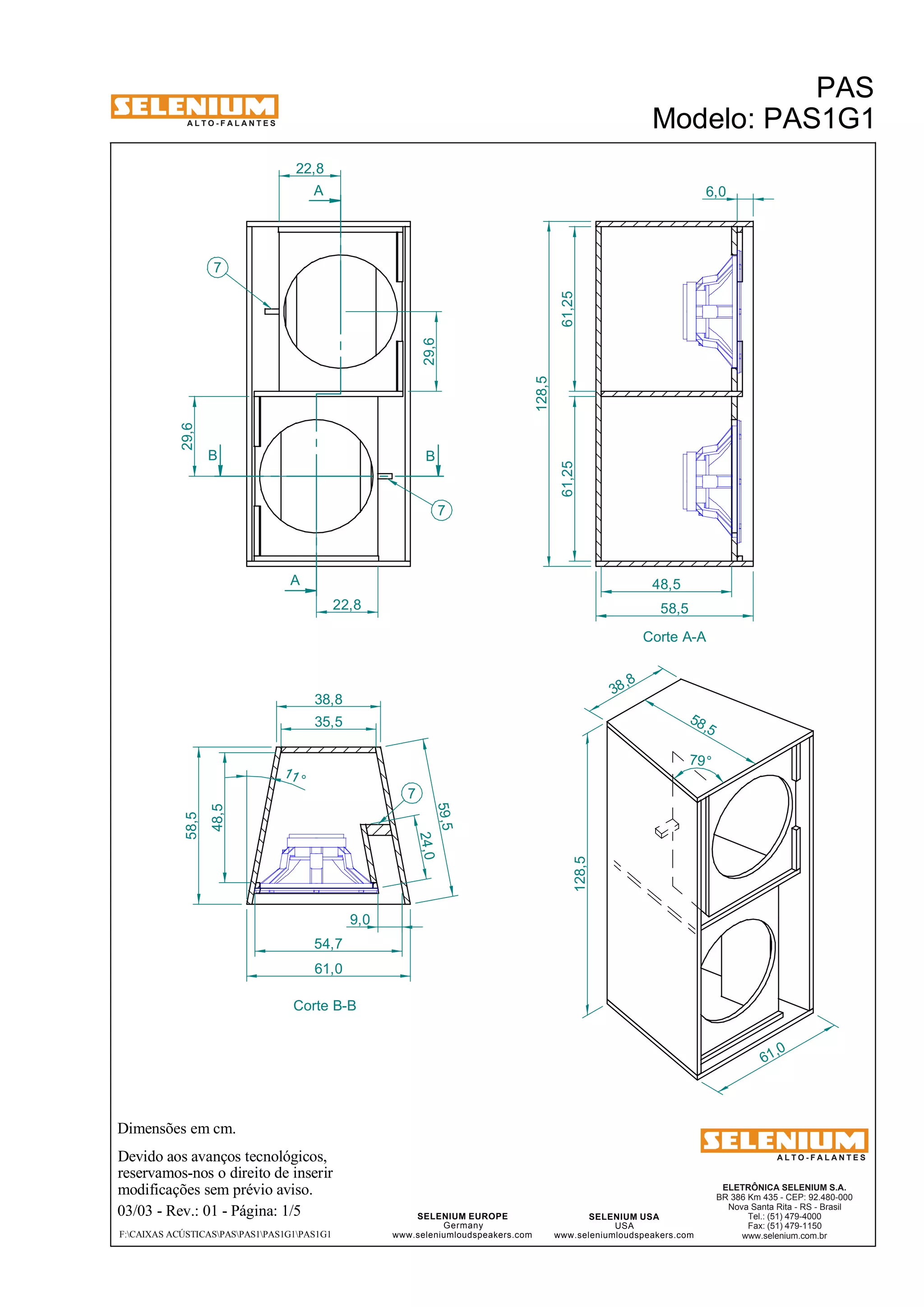 O documento descreve uma caixa acústica trapezoidal de três vias projetada para uso em sistemas de som profissional, contendo um woofer de 15", um mid-bass de 12" e um driver de titânio, com frequências de corte de 120Hz, 300Hz e 1.2kHz. O documento inclui detalhes técnicos, dimensões, componentes e notas sobre a caixa.