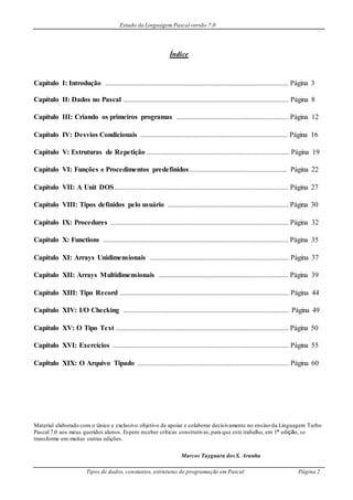 O documento apresenta um capítulo introdutório sobre a linguagem de programação Pascal. Aborda a história da linguagem Pascal, suas características, o ambiente de desenvolvimento Turbo Pascal e os processos de compilação e execução de programas. O documento continua com 16 capítulos tratando de tópicos como tipos de dados, estruturas de programação, desvios condicionais, repetições, funções e procedimentos.
