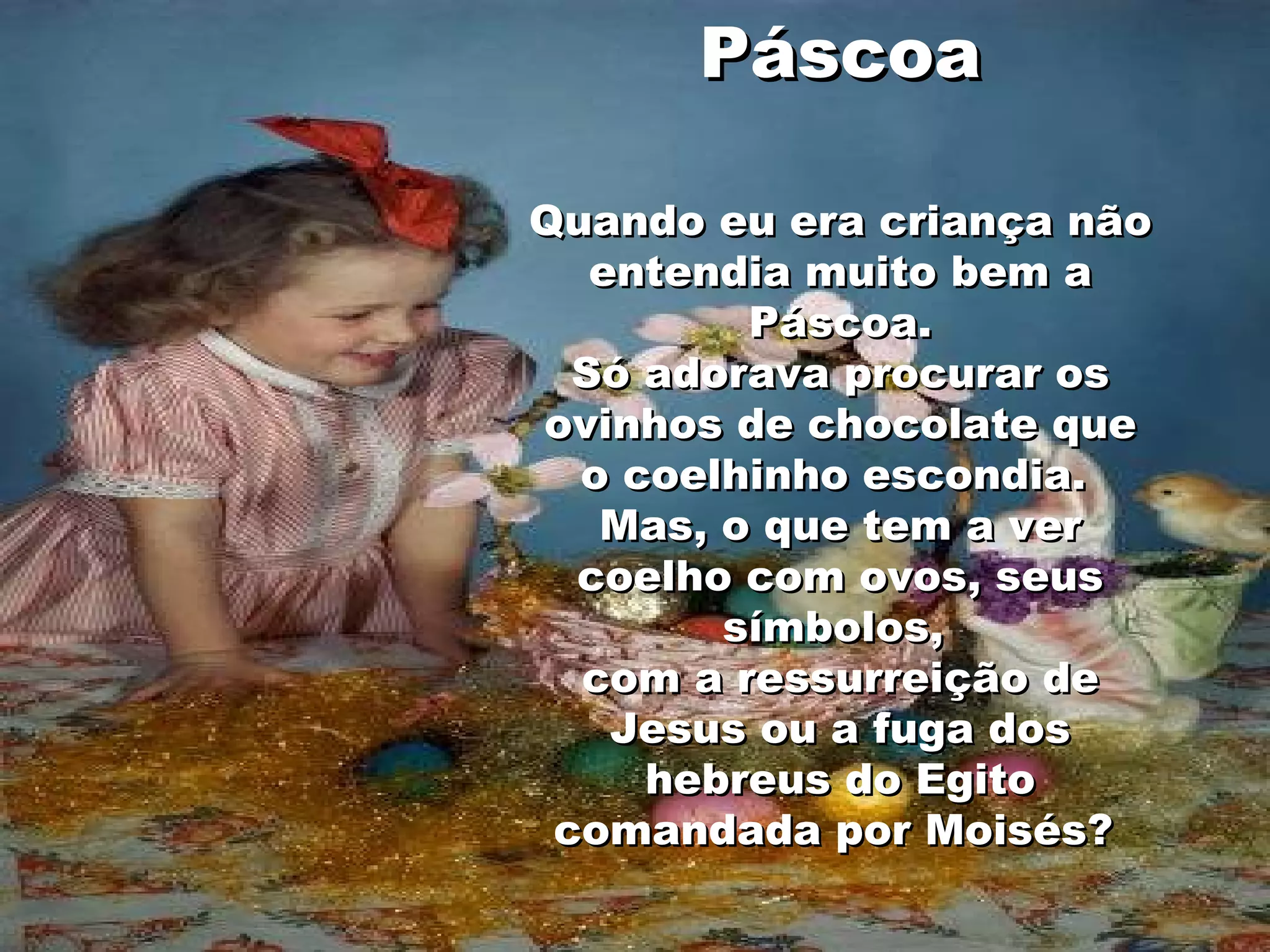 A Páscoa representa o eterno ciclo da vida que renasce, simbolizado pelos ovos e pelo coelho. A fuga dos hebreus do Egito representa renascer à liberdade, enquanto a ressurreição de Jesus é a prova máxima da capacidade de renascer. A Páscoa é um dia para nos libertarmos do mal e renascermos com pureza de alma.