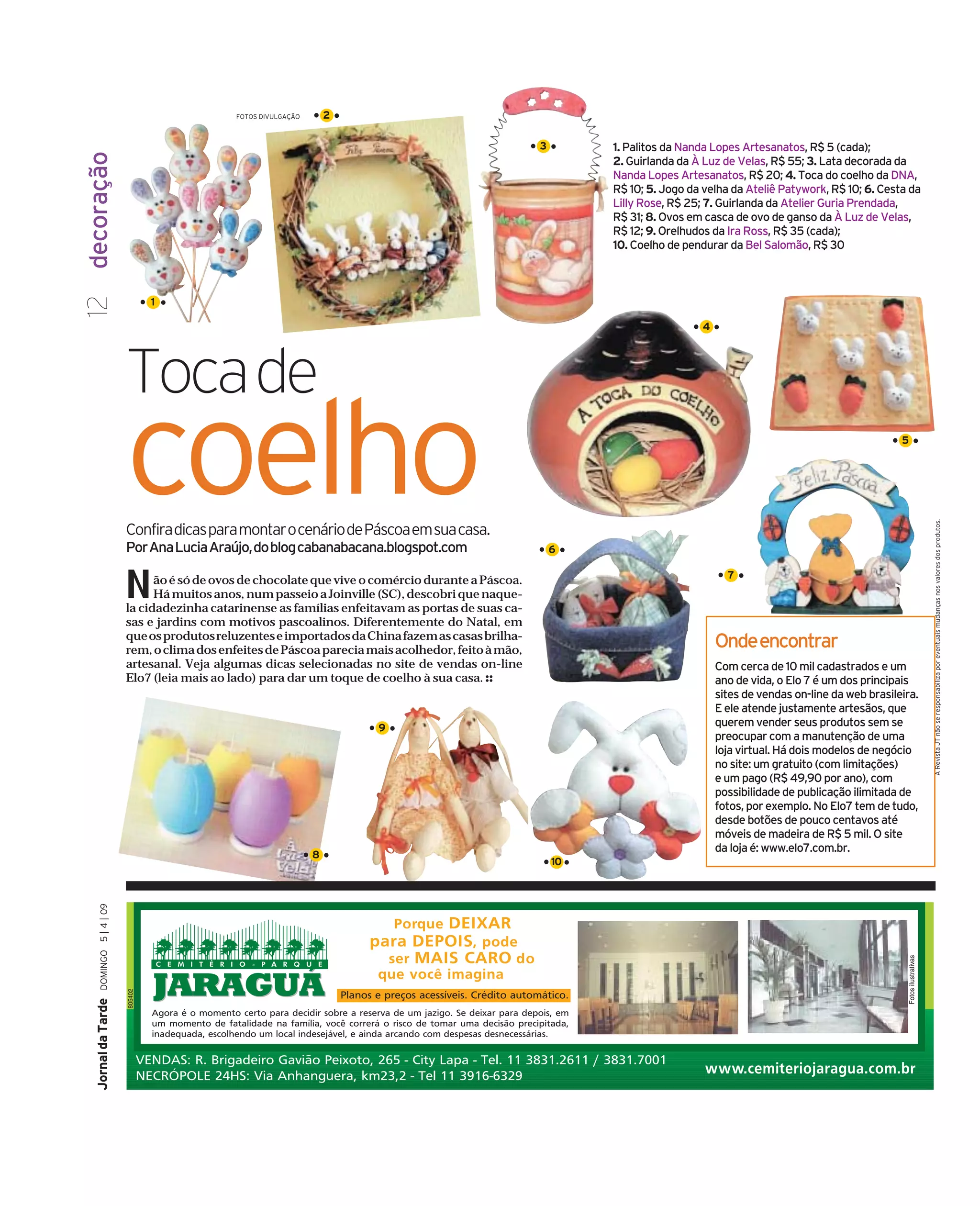 1. O documento fornece dicas de decoração para a Páscoa com enfeites artesanais, incluindo palitos, guirlandas, latas decoradas e tocados de coelho. 2. São listados 10 produtos artesanais encontrados no site de vendas Elo7 com seus respectivos preços. 3. O texto recomenda o site Elo7 para encontrar artesanatos para decorar a casa na Páscoa.