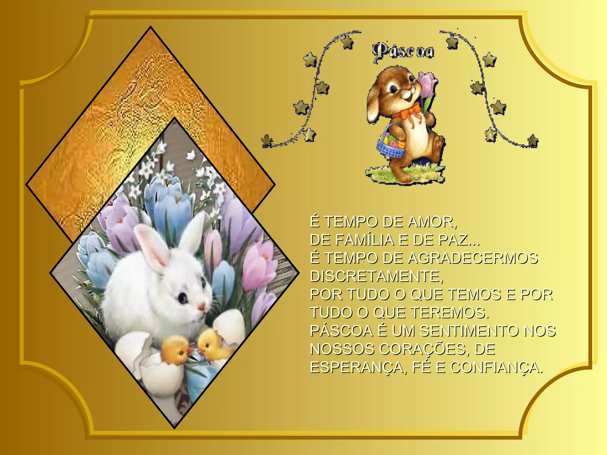 Este documento fala sobre o significado da Páscoa, como um tempo para amor, família, paz e gratidão. Também menciona que a Páscoa traz sentimentos de esperança, fé e confiança, e é um dia para sonhar e lembrar das pessoas importantes em nossas vidas.
