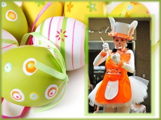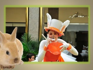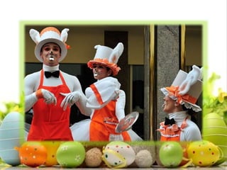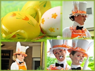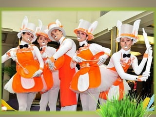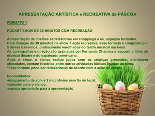 O documento descreve diferentes formatos de apresentações artísticas de Páscoa, incluindo pocket shows e paradas com coelhos sapateadores, todas criadas pela diretora e coreógrafa Fernanda Chamma. As apresentações contam com interação com o público e atividades recreativas para crianças, desenvolvidas por profissionais do teatro musical. O texto também inclui necessidades logísticas para a realização dos eventos e a formação da equipe envolvida.