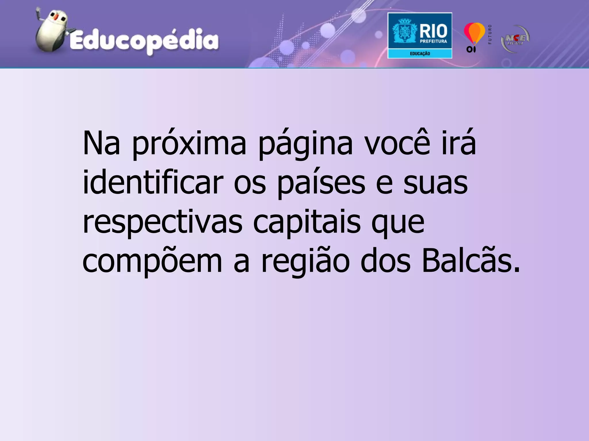 O documento lista os países e suas respectivas capitais que compõem a região dos Balcãs, incluindo Eslovênia, Bósnia-Herzegovina, Croácia, Iugoslávia, Macedônia, Montenegro, Albânia, Grécia, Bulgária, Romênia e Moldávia.