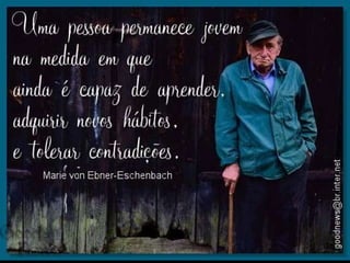 O documento discute como os pais envelhecem e deixam de ser os heróis e heroínas de antes. Com o passar dos anos, eles ficam mais frágeis, esquecidos e cansados, precisando agora de cuidados. No entanto, os filhos têm dificuldade em aceitar essa mudança e ficam irritados quando os pais cometem erros, esquecimentos ou contam histórias repetidas, em vez de terem paciência e cuidarem deles como fizeram no passado.