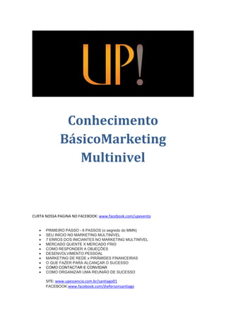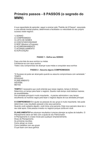 O documento fornece instruções sobre os primeiros passos no marketing multinível, destacando 8 etapas essenciais: sonho, compromisso, lista de contatos, convite, apresentação do plano, acompanhamento, aconselhamento e duplicação do processo. Também discute erros comuns de iniciantes, como reinventar a estratégia em vez de seguir os princípios básicos do marketing de rede.