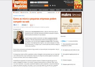 O documento lista links de acesso a sites e lojas virtuais de empresas de diferentes setores, como educação, madeireira, restaurante, advocacia, odontologia, construção civil, iluminação, buffet, cabeleireiro, imobiliária, perfumaria, eletrônicos, moda, móveis e erotismo. Em seguida, enumera as vantagens de ter presença online para os empreendedores, como divulgação, aproximação com clientes, vendas diretas e aumento do faturamento.