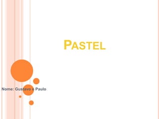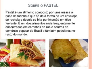 O documento descreve o pastel, um alimento popular no Brasil feito de massa recheada e frita. Existem variações no recheio, incluindo opções salgadas como bacalhau, carne moída ou queijo, e doces como chocolate e banana. Os autores opinam que os pasteis são ótimos com diferentes recheios e que o de frango é o mais saboroso.