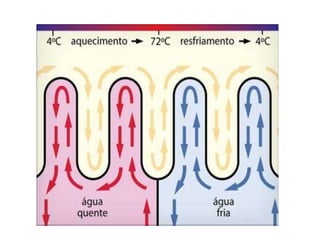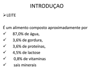 O documento descreve o processo de pasteurização do leite, incluindo a composição do leite, tipos de pasteurização, equipamentos usados e etapas do processo como ordenha, resfriamento, pasteurização e envase. A pasteurização é essencial para eliminar microrganismos patogênicos e aumentar a vida de prateleira do leite.