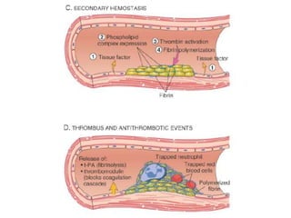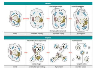 O documento discute processos de morte celular, distúrbios da circulação como hiperemia e congestão, hemostasia e hemorragia. A morte celular pode ocorrer por necrose ou apoptose. A hiperemia é o aumento de sangue nos vasos e pode ser ativa ou passiva. A hemostasia envolve a parede vascular, plaquetas e sistema de coagulação para controlar sangramentos. A hemorragia é a saída de sangue para fora dos vasos.