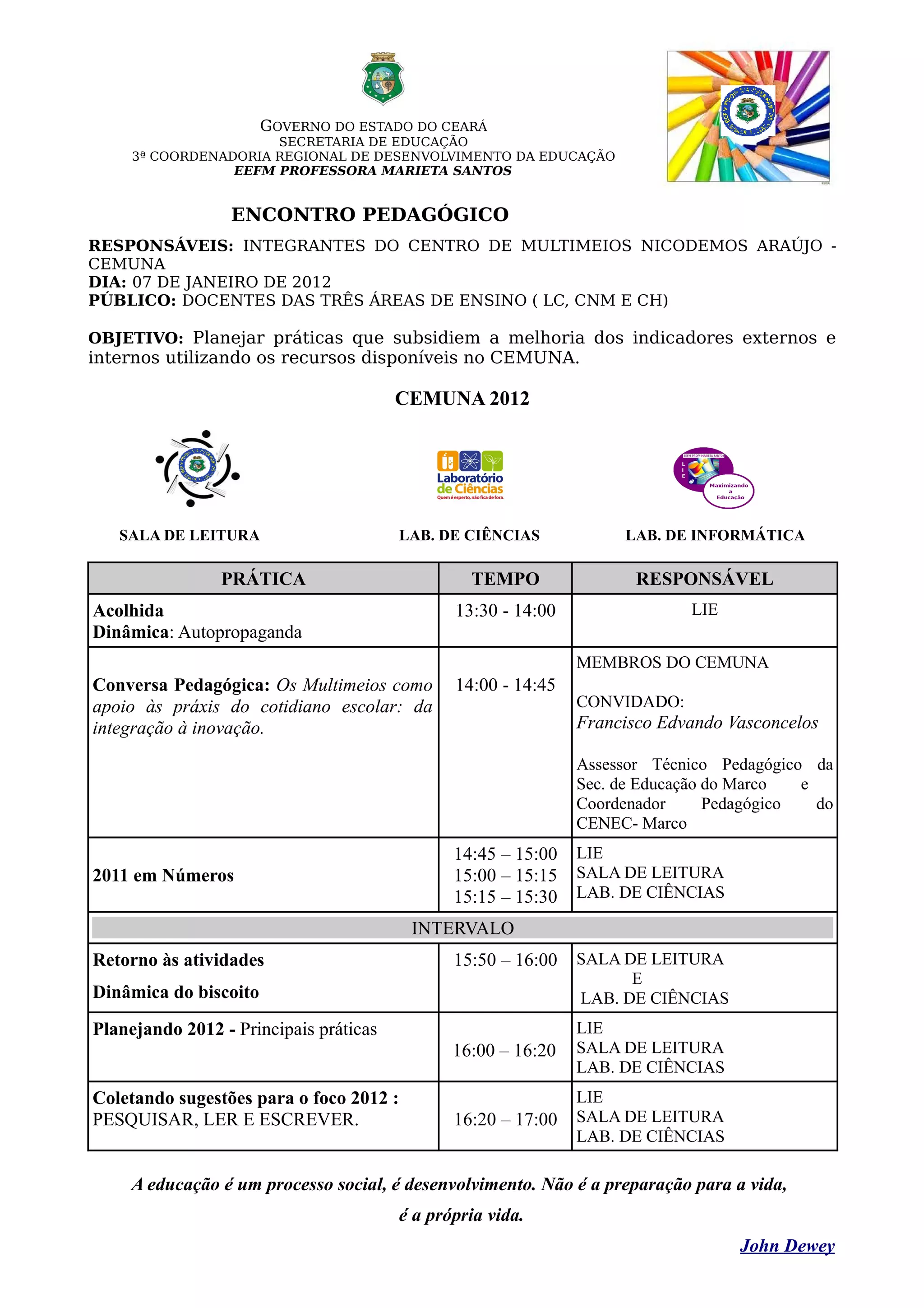 Este documento descreve um encontro pedagógico realizado na EEFM Professora Marieta Santos em 7 de janeiro de 2012. O objetivo do encontro foi planejar práticas para melhorar os indicadores da escola utilizando os recursos do Centro de Multimeios Nicodemos Araújo. A programação incluiu dinâmicas, apresentações sobre o uso de multimeios e coleta de sugestões para o foco do ano de 2012 em pesquisa, leitura e escrita.