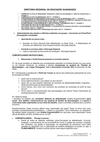 1. O documento descreve os objetivos e agenda de um encontro de formação continuada com professores do ciclo de alfabetização. Os objetivos incluem discutir currículo, concepções de alfabetização e avaliação, bem como planejamento das aulas.