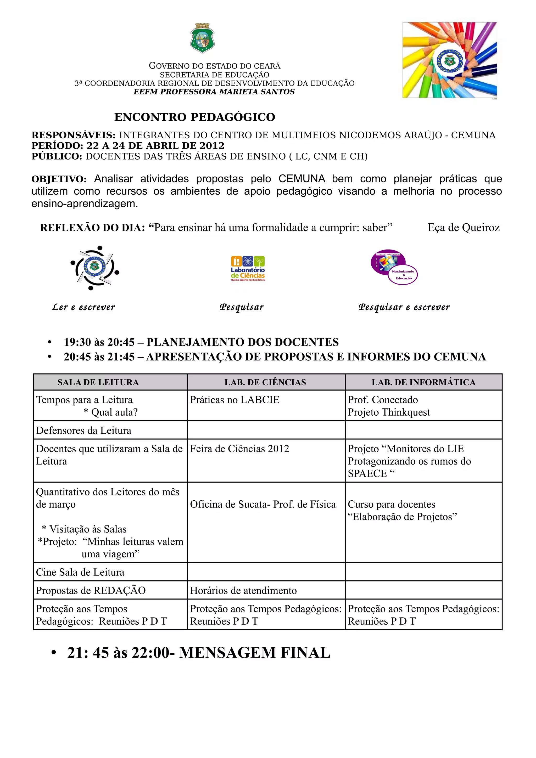 Este documento descreve um encontro pedagógico realizado entre 22 e 24 de abril de 2012 com docentes de três áreas de ensino da Escola EEFM Professora Marieta Santos. O objetivo foi analisar atividades propostas pelo Centro de Multimeios Nicodemos Araújo e planejar práticas pedagógicas que utilizem recursos dos laboratórios de apoio visando melhorar o processo de ensino-aprendizagem. A programação incluiu planejamento docente, apresentações do CEMUNA e visitas aos