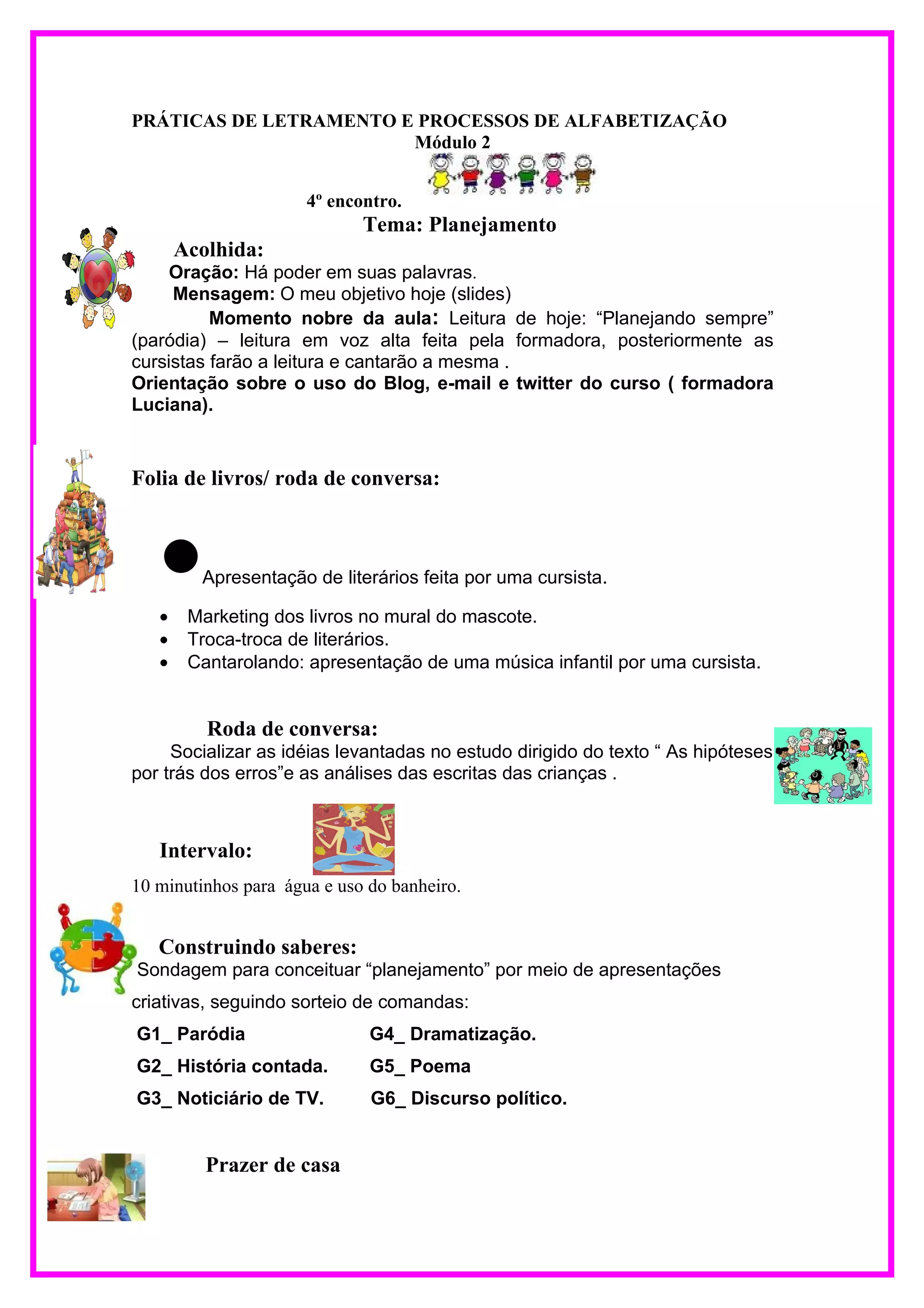 O documento descreve o planejamento de um encontro de formação de professores com as seguintes atividades: 1) Acolhida com oração e mensagem; 2) Momento de leitura e canto; 3) Apresentação de literários e troca de livros; 4) Roda de conversa sobre texto estudado; 5) Intervalo; 6) Construção do conceito de planejamento por grupos de forma criativa; 7) Tarefa de pesquisa sobre planejamento.