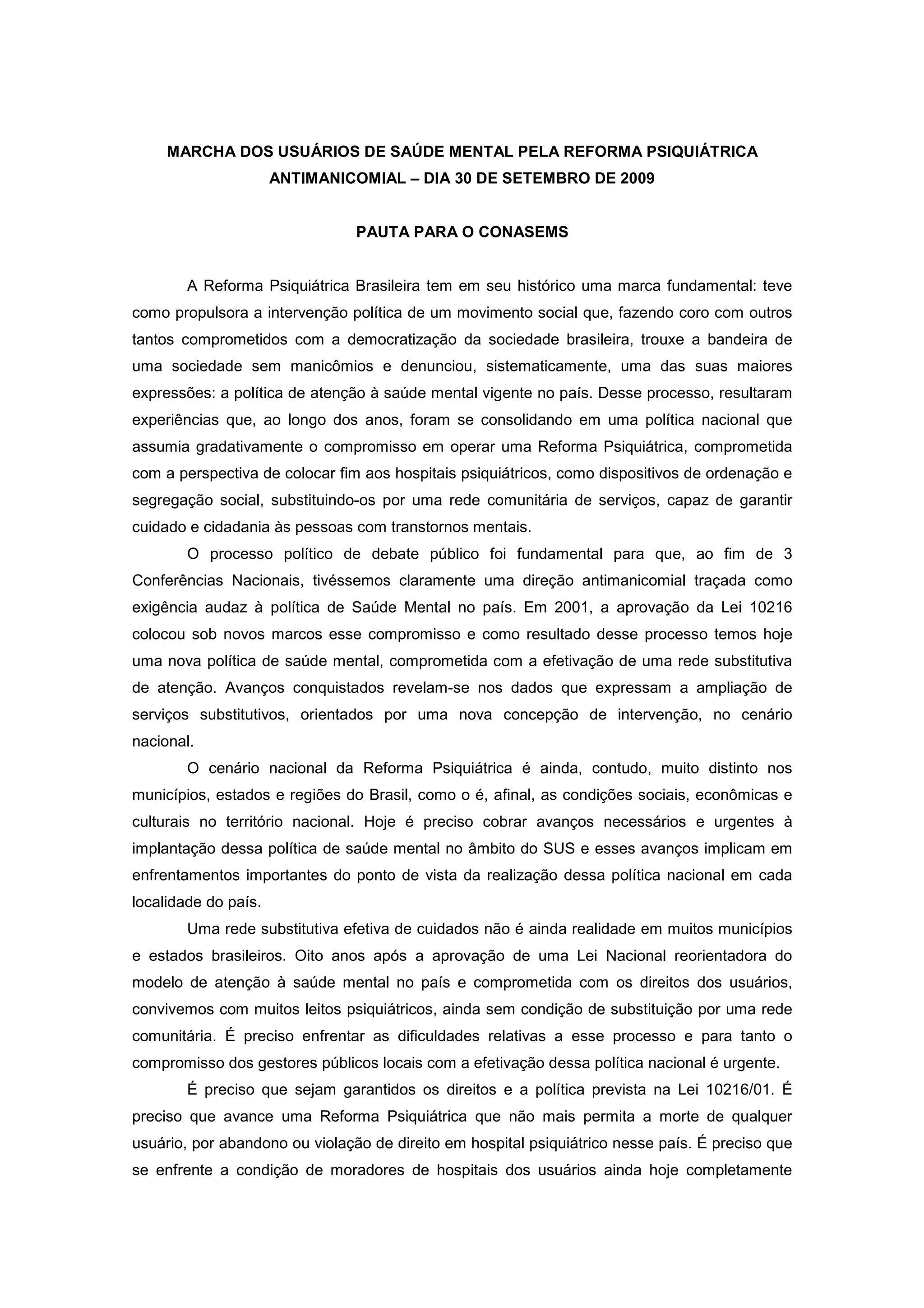 1) O documento discute a necessidade de avançar a Reforma Psiquiátrica Brasileira através de um pacto de compromisso entre gestores de saúde para garantir os direitos dos usuários de saúde mental.