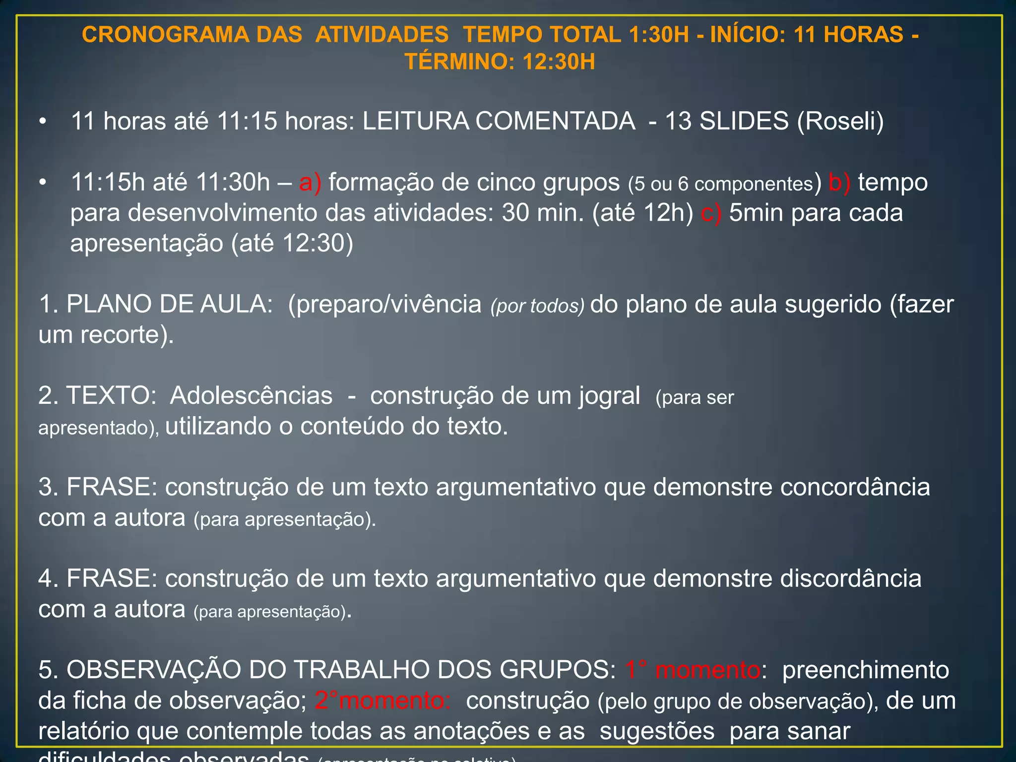 O cronograma planeja atividades de 1h30min sobre leitura comentada e discussão de texto. Inclui formação de grupos para desenvolver plano de aula, jogral, textos concordando ou discordando da autora e observação dos trabalhos dos demais grupos.