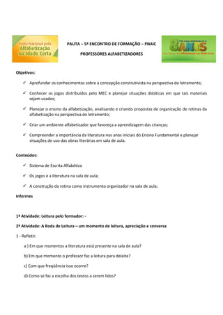 Este documento apresenta a pauta de um encontro de formação para professores alfabetizadores. Os objetivos incluem aprofundar os conhecimentos sobre a concepção construtivista da alfabetização, planejar o uso de jogos educativos e organizar atividades de rotina em sala de aula que envolvam leitura e literatura.