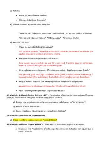 1. O documento descreve a pauta de um encontro de formação de professores alfabetizadores com o objetivo de analisar projetos didáticos e seqüências didáticas para turmas de alfabetização considerando a heterogeneidade dos alunos. 2. As atividades incluem leitura de contos, análise do uso de portfólios, discussão sobre organização do tempo e espaço na sala de aula, análise de projetos didáticos e reescrita colaborativa de contos. 3. A socialização do trabalho desenvolvido