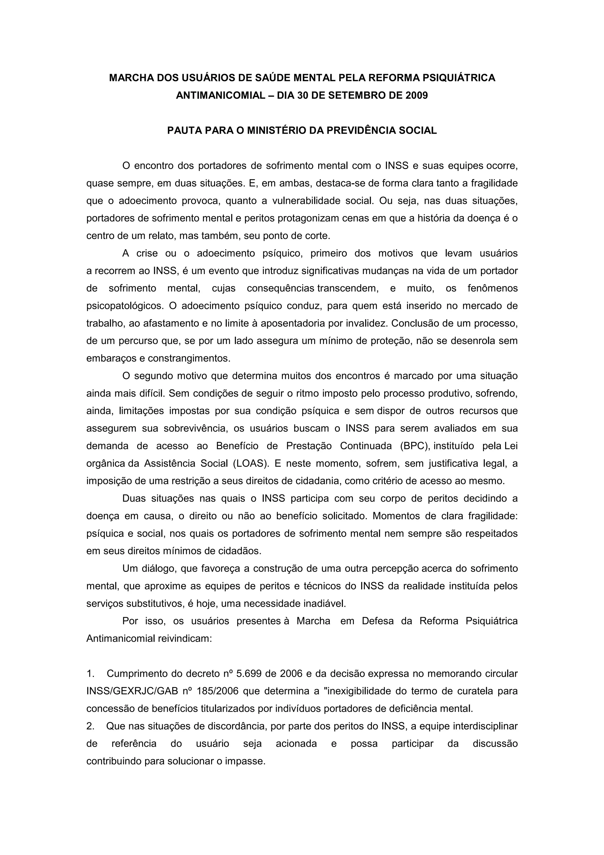 O documento descreve uma marcha de usuários de saúde mental pela reforma psiquiátrica antimanicomial. Ele lista demandas direcionadas ao Ministério da Previdência Social, incluindo o cumprimento de decretos que determinam a "inexigibilidade do termo de curatela" para concessão de benefícios a portadores de deficiência mental e a inclusão da equipe de referência do usuário em situações de discordância entre peritos do INSS.