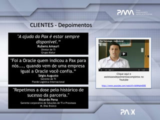 O documento apresenta três depoimentos de clientes da Pax elogiando os serviços da empresa. Rubens Amauri, da Grupo Alatur, destaca a disponibilidade de ajuda. Sérgio Augusto, da Fiorde Logística, comenta que a Oracle indicou a Pax e, por vir de empresa como a Oracle, há confiança. Ricardo Pena, da M. Dias Branco, diz que repetiram a parceria pela história de sucesso.