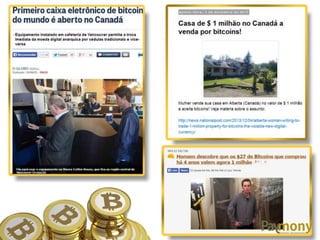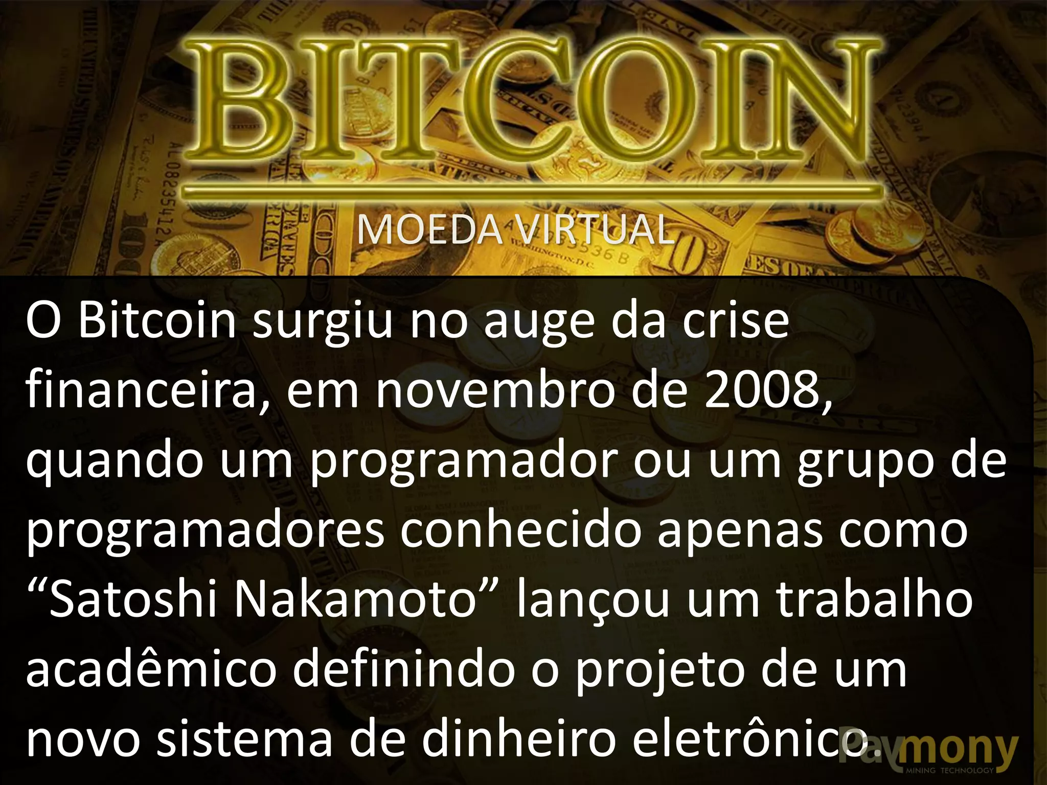 MOEDA VIRTUAL O Bitcoinsurgiu no auge da crise financeira, em novembro de 2008, quando um programador ou um grupo de programadores conhecido apenas como “Satoshi Nakamoto” lançou um trabalho acadêmico definindo o projeto de um novo sistema de dinheiro eletrônico.