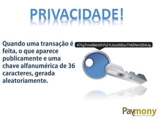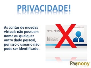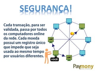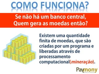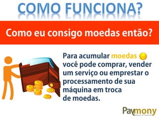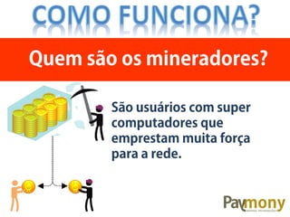 A desenvolveu três pacotesde produtos que atendem aos principais perfis de investidores, e são eles: MINING TECHNOLOGY PACOTE MINING (Mineração) Será instalado em seu computador um software para garimpar, e você passará a receber da Paymony um Computer Miner Rental, e mais o plano de remuneração, com limite do pagamento no bônus binário de US$ 5.000,00 diários. PACOTE VIRTUAL FARM (Fazendas virtuais) Além de receber pela mineração (Computer Miner Rental), você terá participação nos lucros gerados pelos mineiros e mais o plano de remuneração, com limite do pagamento no bônus binário de US$ 10.000,00 diários. PACOTE PAYCOIN Além dos ganhos acima, você terá participação nos lucros gerados pelas fazendas, e mais o plano de remuneração, com limite do pagamento no bônus binário de US$ 25.000,00 diários.