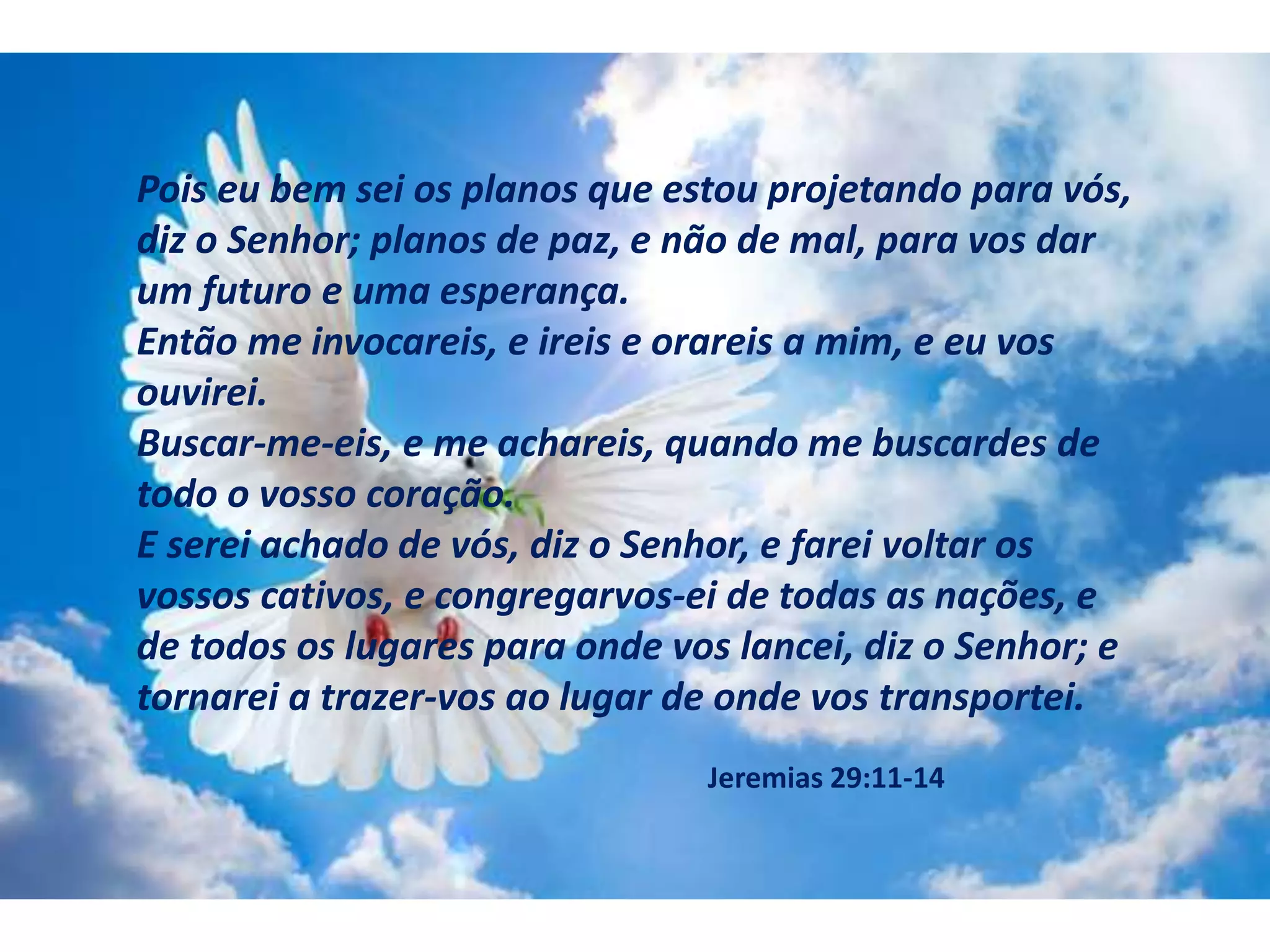 Deus promete planos de paz e não de mal para seu povo, e promete ouvi-los e ser encontrado se buscarem a Ele com todo o coração. Ele também promete trazer de volta seu povo do cativeiro e reuní-los de todas as nações.