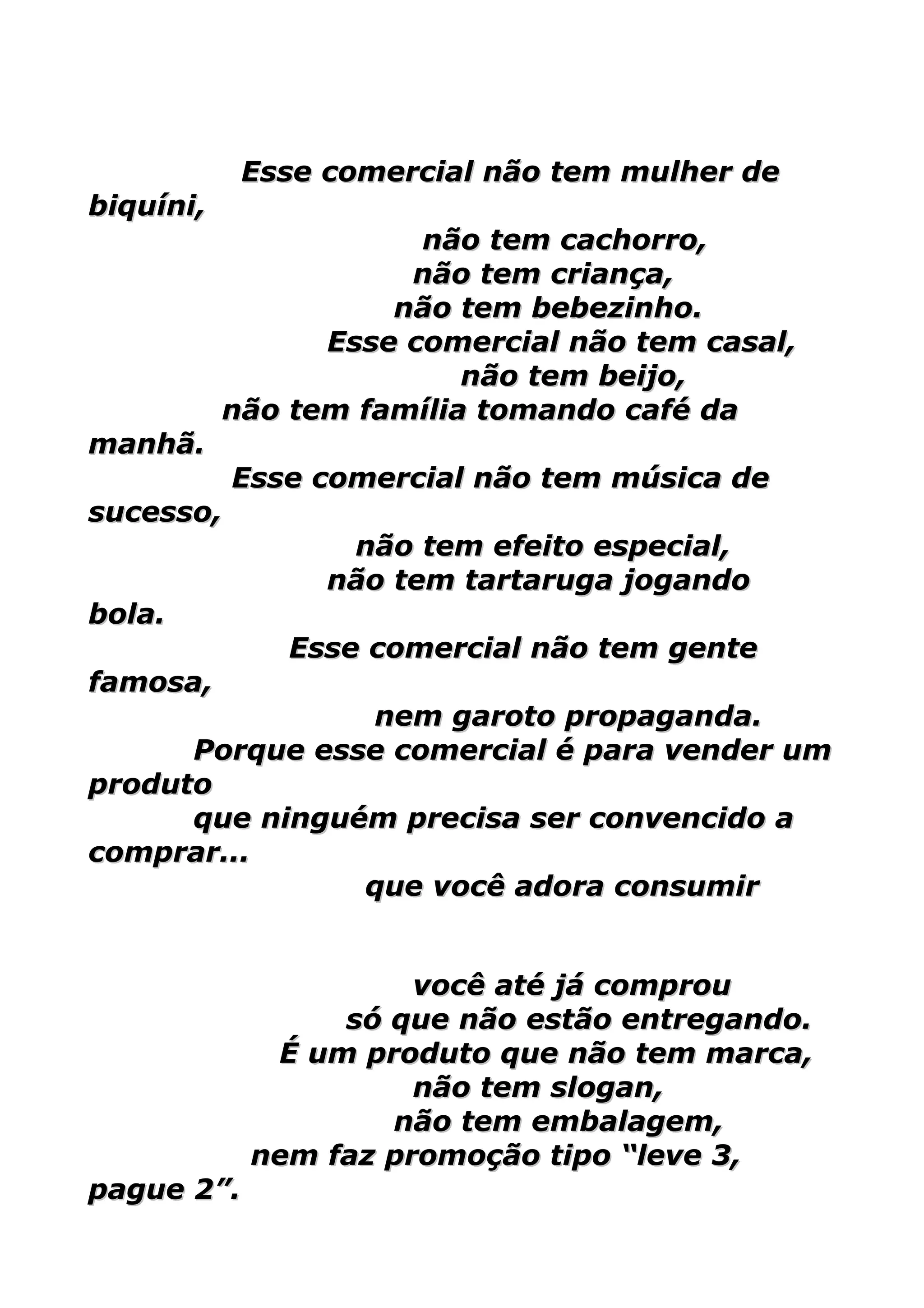 Este comercial promove a paz de uma forma não convencional, sem os elementos típicos de marketing como mulheres de biquíni ou músicas populares. Ele argumenta que a paz é um produto valioso que todos precisam e que quanto mais usarmos a paz em nossas vidas e interações, mais teremos dela para compartilhar.