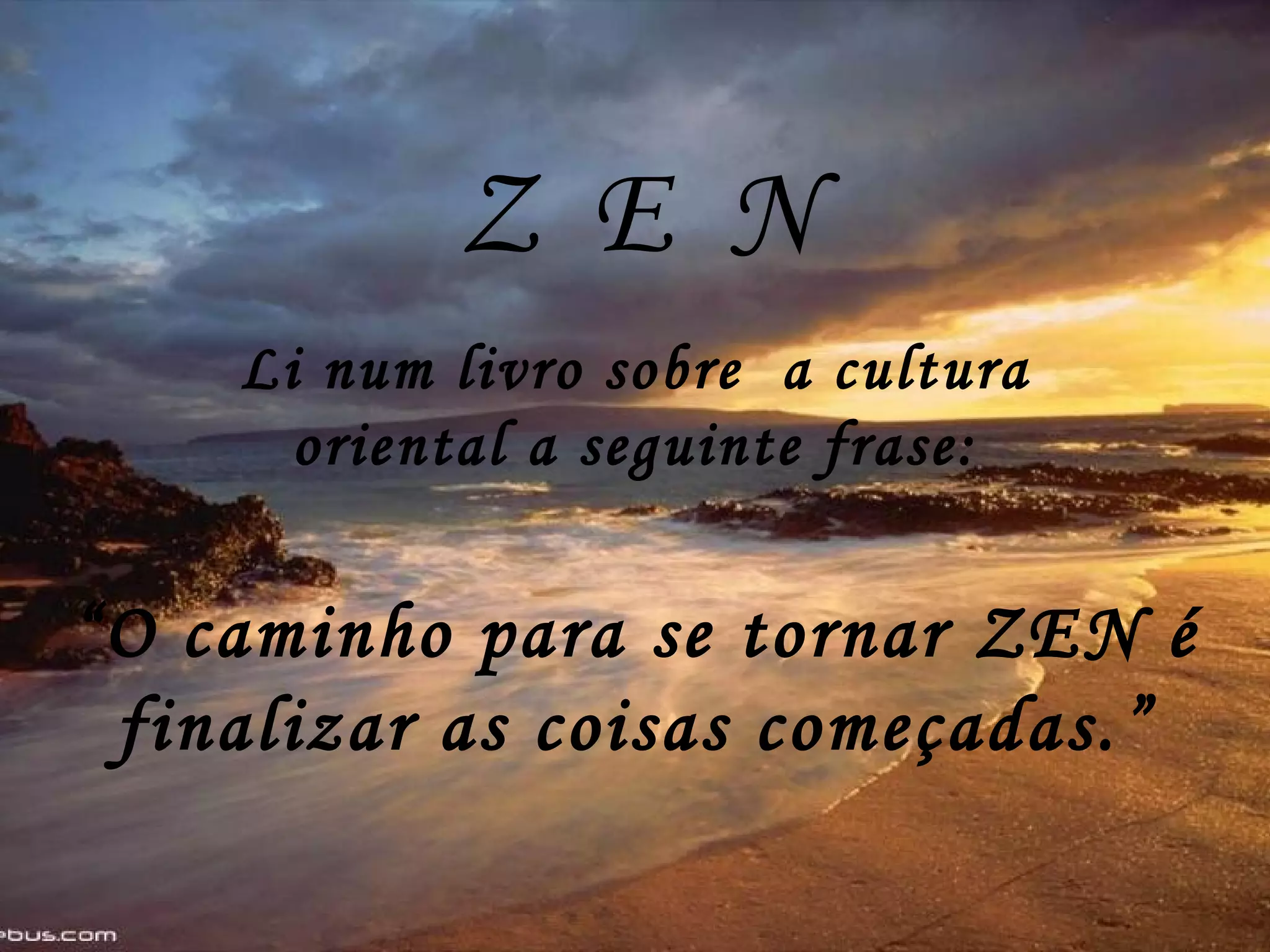 O autor leu que o caminho para se tornar zen é finalizar as coisas começadas. Ele olhou em volta e viu várias coisas inacabadas, então decidiu terminar tudo ontem, incluindo uma garrafa de uísque, um salaminho, queijo de cabra, castanhas, chocolate, vinho e pizza. Agora ele se sente zen e compartilha isso com aqueles que precisam de paz interior.