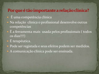 O documento discute a importância da comunicação clínica entre profissionais de saúde e pacientes. Ele enfatiza que a comunicação é uma competência essencial, é terapêutica e pode melhorar os resultados dos pacientes. Além disso, destaca que os pacientes valorizam especialmente a acessibilidade, tempo de consulta e recebimento de informações claras.
