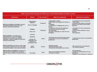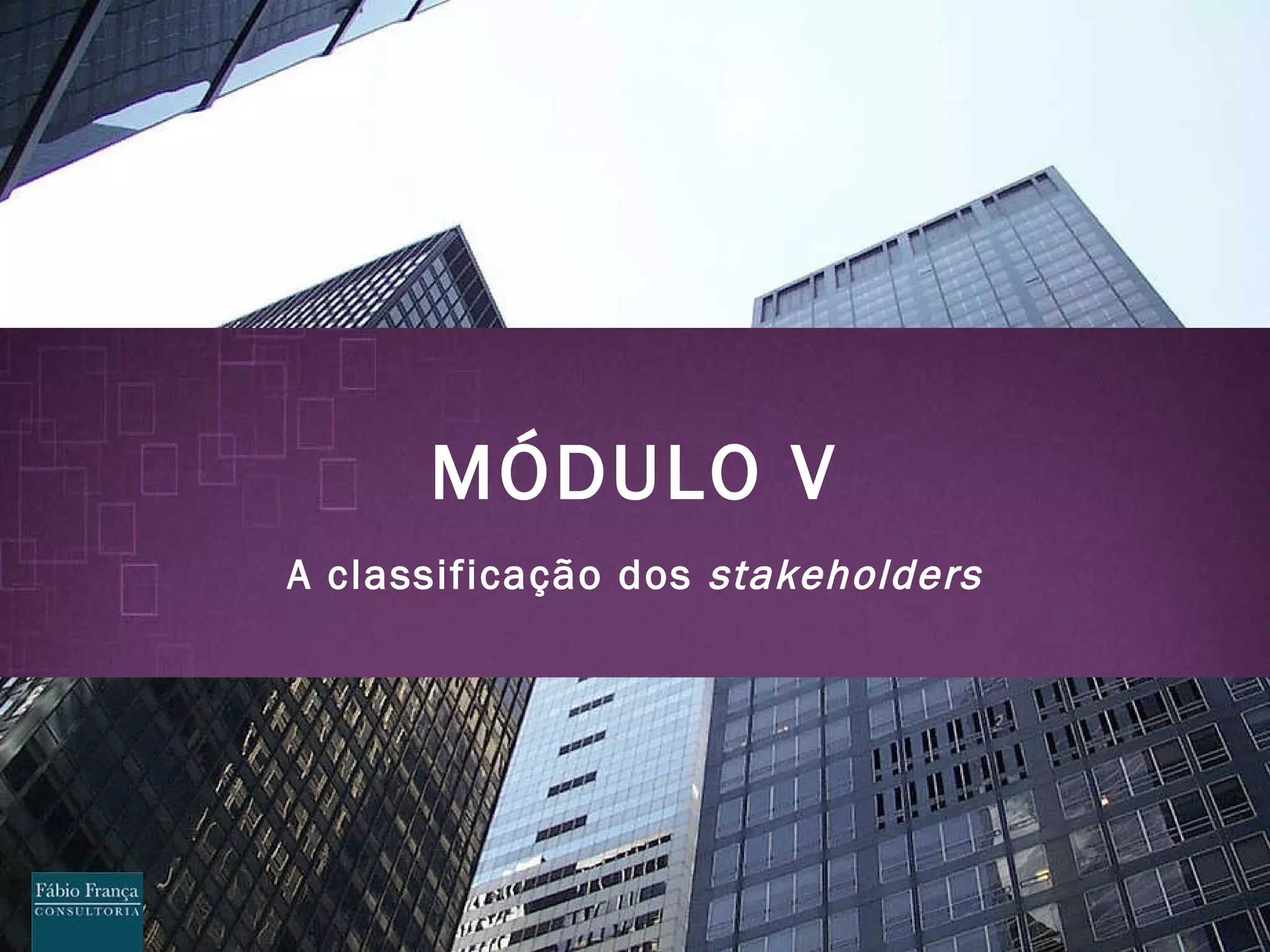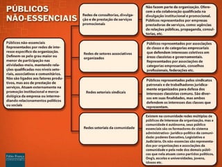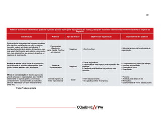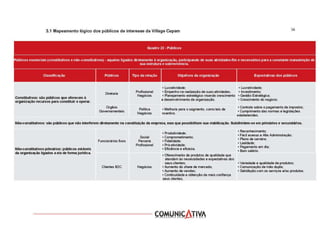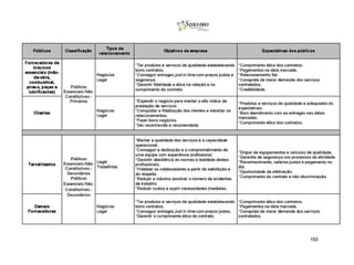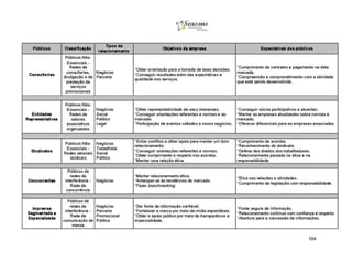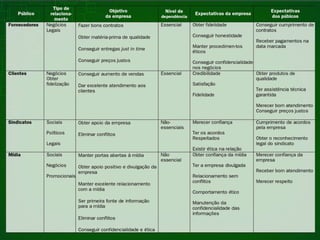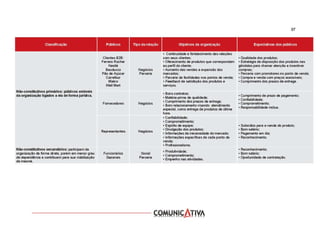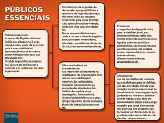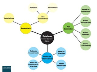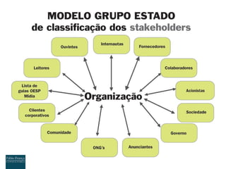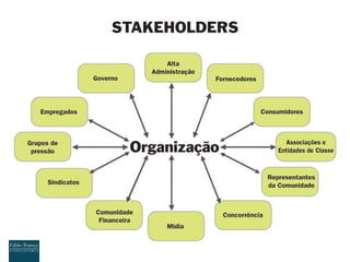 O documento discute o conceito de stakeholders e sua classificação. Define stakeholders como grupos que influenciam ou são influenciados pela organização, incluindo acionistas, governo, consumidores, funcionários e comunidade. Apresenta critérios para classificar os stakeholders de acordo com seu nível de dependência e influência na organização.