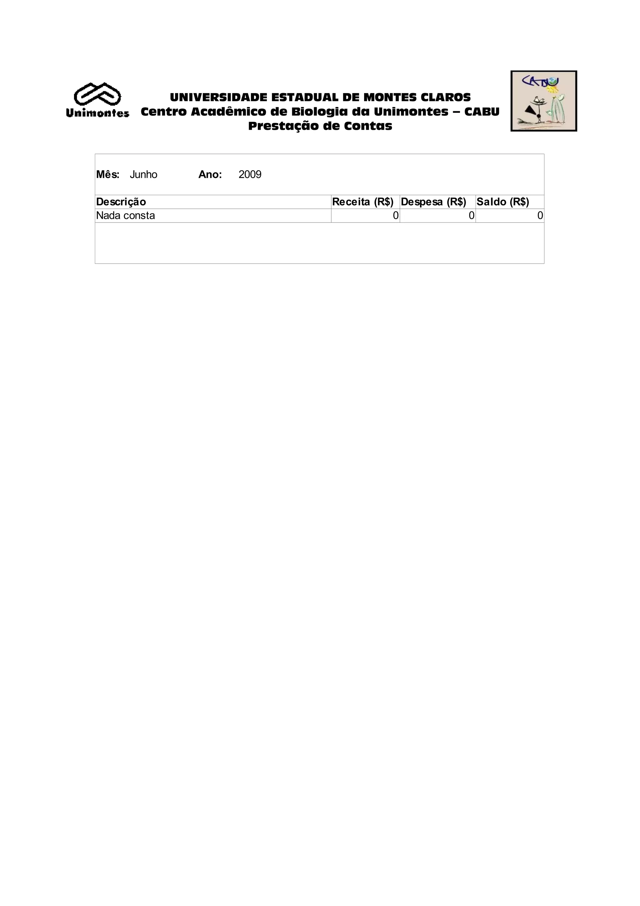 O relatório de prestação de contas do Centro Acadêmico de Biologia da Unimontes para junho de 2009 mostra que não houve receitas ou despesas no mês, mantendo o saldo inicial em zero reais.