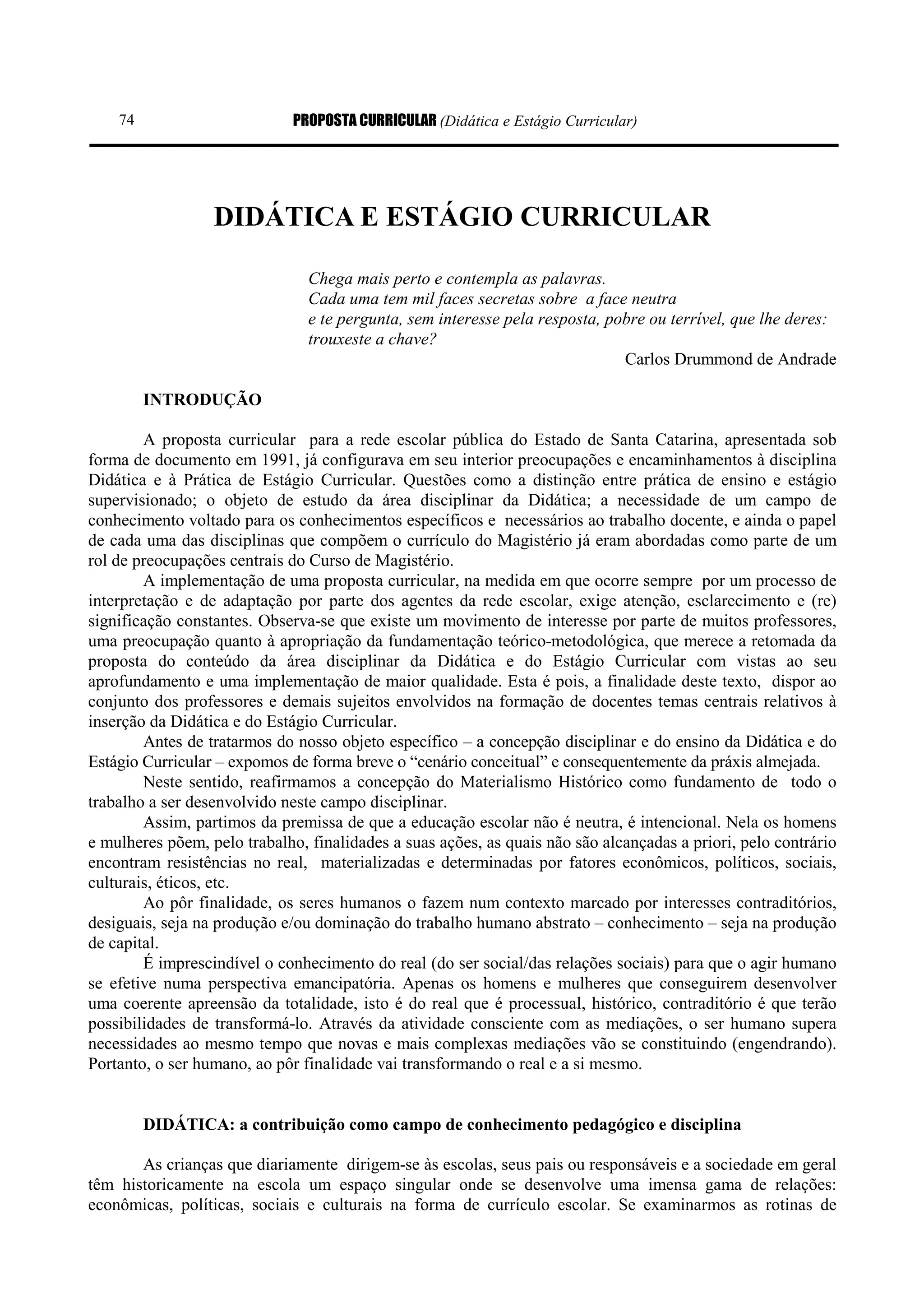 Este documento discute a proposta curricular para a disciplina de Didática e Estágio Curricular no curso de Magistério. Apresenta a Didática como um campo de conhecimento pedagógico focado nos processos de ensino e aprendizagem e defende que os professores precisam desenvolver saberes específicos sobre educação. Também argumenta que é necessário questionar constantemente as práticas escolares e a função social da escola para que esta possa servir como um espaço de emancipação.