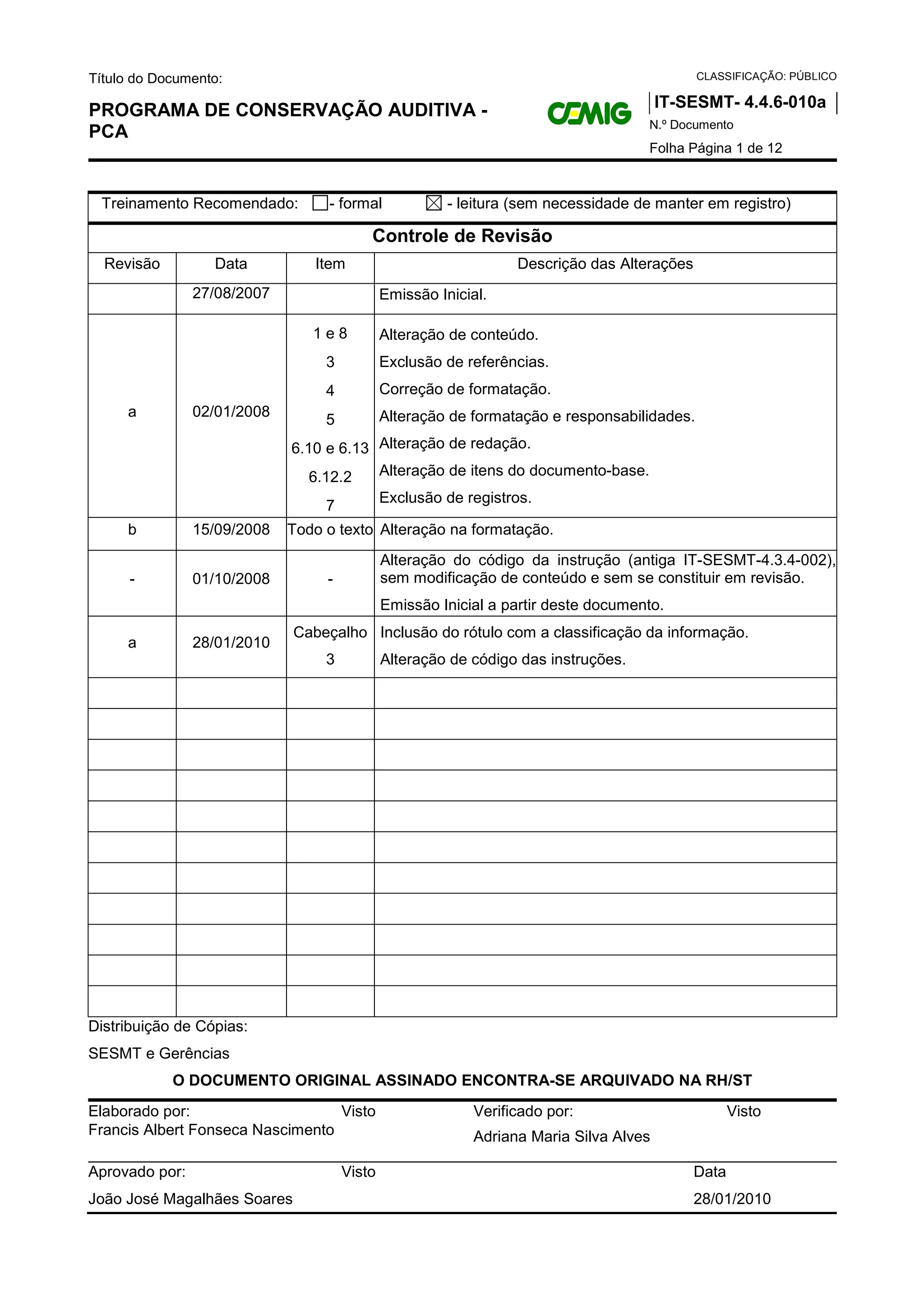 Este documento estabelece diretrizes para a elaboração e implementação do Programa de Conservação Auditiva (PCA) nas gerências da Cemig. O PCA tem como objetivo proteger a saúde auditiva dos empregados expostos a níveis de pressão sonora elevados. O documento define as responsabilidades dos diferentes atores no programa, como a realização de avaliações ambientais, uso de equipamentos de proteção, exames audiométricos e treinamentos.