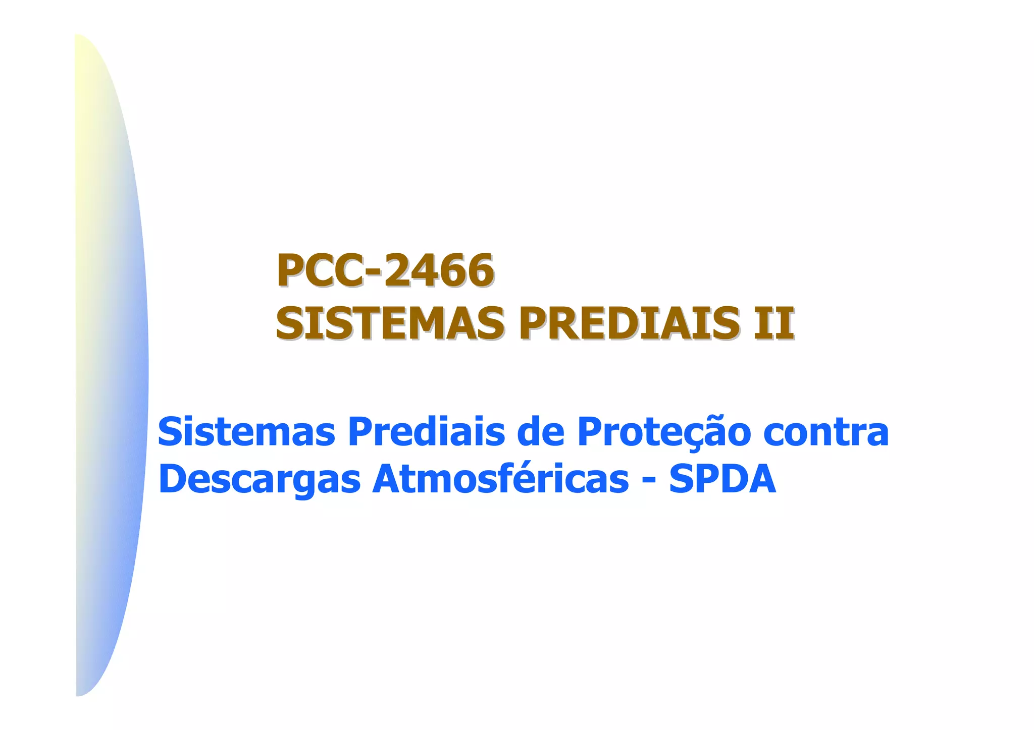 O documento descreve os principais componentes e conceitos de um Sistema de Proteção contra Descargas Atmosféricas (SPDA), incluindo: 1) a definição de SPDA e seus componentes externos e internos; 2) os conceitos básicos de descarga atmosférica, raio e relâmpago; 3) a formação de cargas elétricas nas nuvens; 4) os tipos de SPDA, como as hastes do tipo Franklin e gaiolas de Faraday.