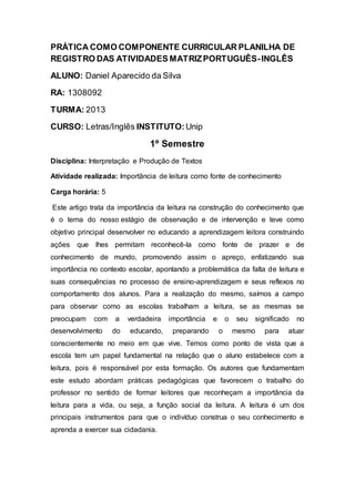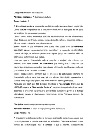 Este documento contém registros de atividades realizadas por um aluno em diferentes disciplinas ao longo de um semestre. As atividades incluem discussões sobre a importância da leitura, diversidade cultural, níveis de linguagem, estrutura de texto e análise de peças publicitárias sobre meio ambiente.