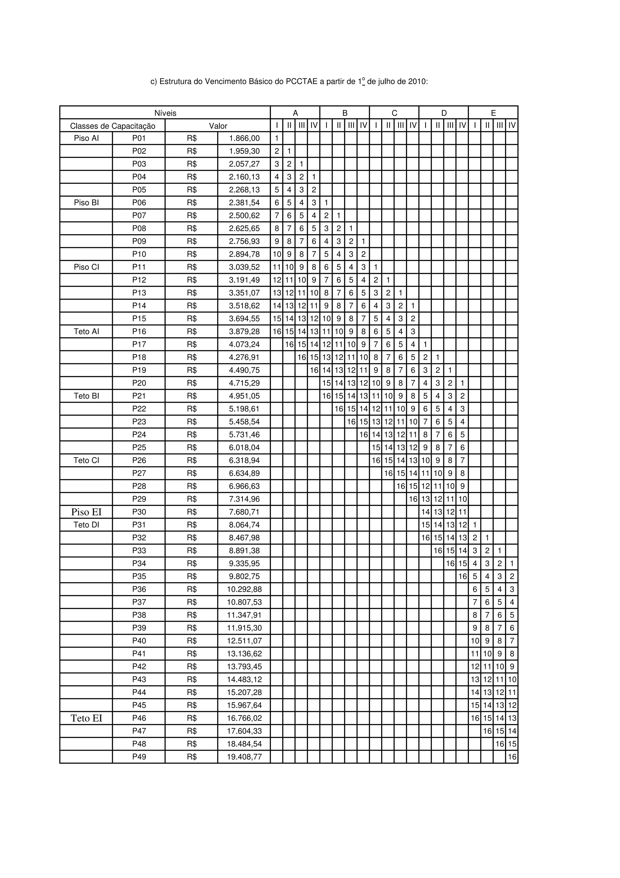 Este documento apresenta a estrutura do vencimento básico do PCCTAE a partir de 1o de julho de 2010, com 49 níveis salariais distribuídos em 5 classes de capacitação (AI, BI, CI, DI e EI) e 5 níveis (A, B, C, D e E). Cada nível salarial possui um valor em reais.