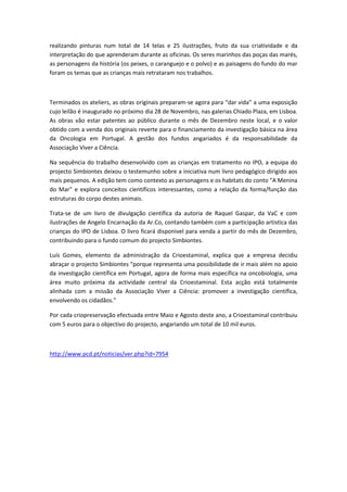 O projeto Simbiontes envolveu crianças do IPO de Lisboa em ateliês artísticos e científicos para criar obras que serão leiloadas para angariar fundos para pesquisa do câncer em Portugal. As crianças ilustraram seres marinhos e cenas do fundo do mar após ouvirem uma história. Um livro sobre o projeto também será vendido para arrecadar recursos.