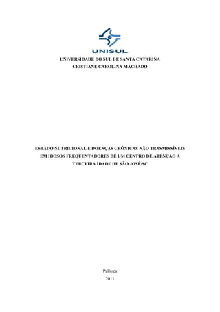 Este documento apresenta um estudo sobre o estado nutricional e doenças crônicas em idosos frequentadores de um Centro de Atenção à Terceira Idade em São José, Santa Catarina. O estudo avaliou 17 idosos através de avaliação antropométrica e verificação de doenças crônicas. Os resultados apontaram que 58,82% apresentaram eutrofia e 41,18% sobrepeso. As doenças crônicas mais frequentes foram hipertensão arterial (41,17%) e ausência de doen