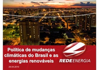 O documento discute as políticas de mudança climática do Brasil e as energias renováveis. Aborda os riscos e oportunidades das políticas nacionais, estaduais e municipais de mudança climática para empresas e setores produtivos. Também menciona novas exigências regulatórias em termos de compliance ambiental, avaliação de impactos climáticos e índices de carbono para empresas.