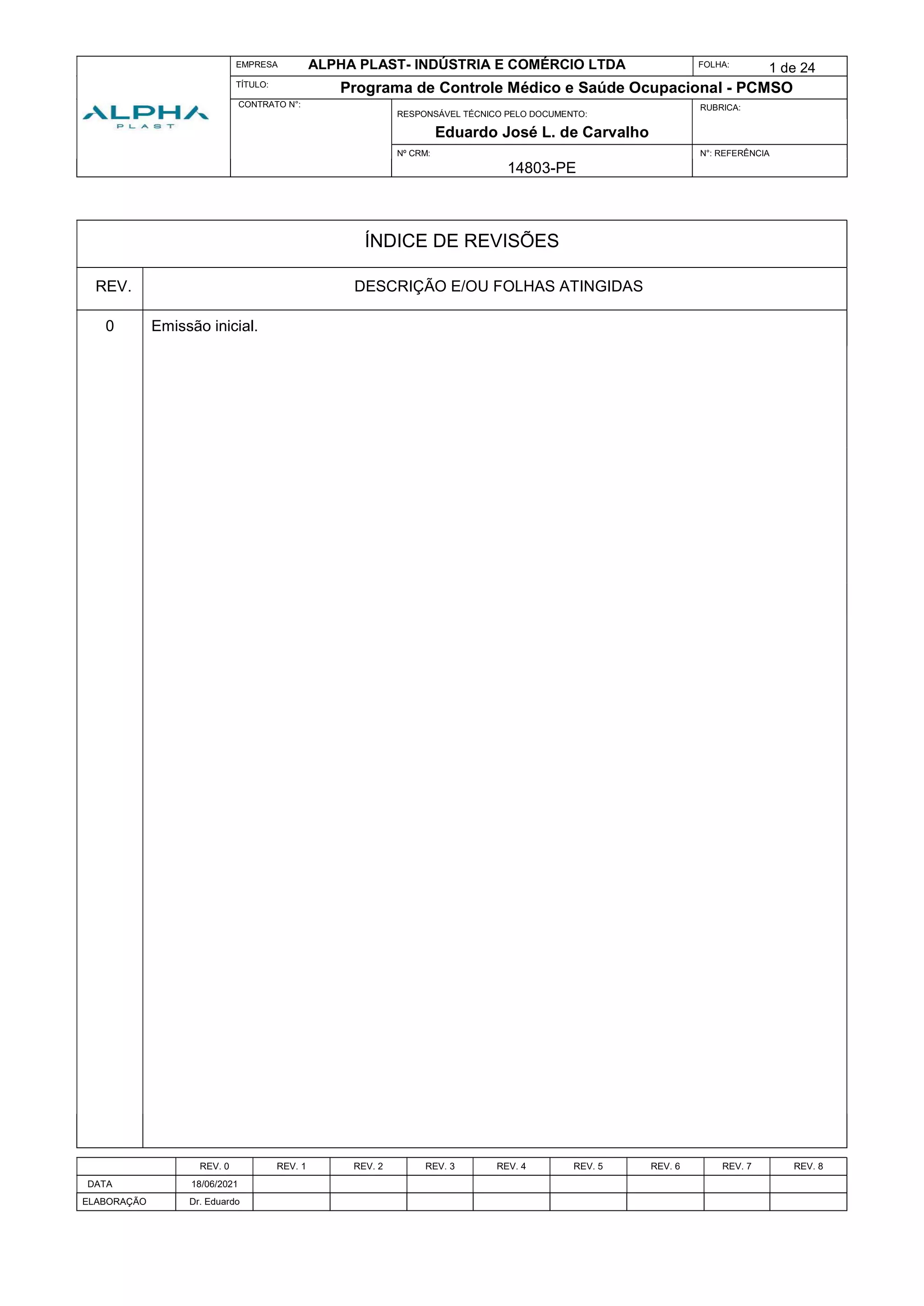 O documento apresenta o Programa de Controle Médico e Saúde Ocupacional (PCMSO) da empresa ALPHA PLAST- INDÚSTRIA E COMÉRCIO LTDA. Ele define as atividades e responsabilidades previstas no PCMSO, incluindo exames médicos obrigatórios, grupos homogêneos de exposição e cronograma de ações. O documento também descreve o processo produtivo da empresa e fornece modelos de documentos relacionados ao PCMSO.