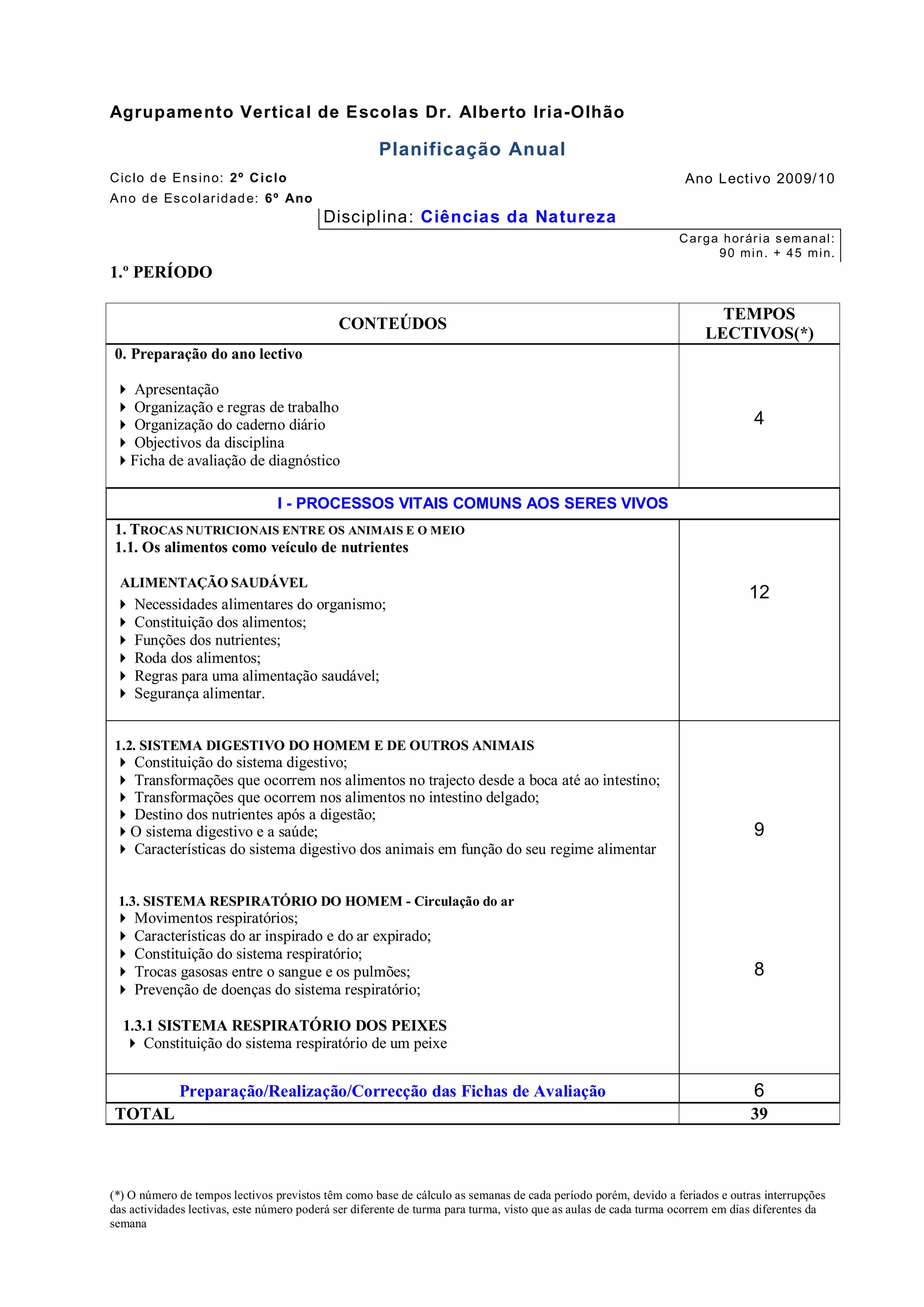 Este documento apresenta o plano de ensino de Ciências da Natureza para o 6o ano de escolaridade. Está dividido em três períodos com diferentes unidades temáticas, incluindo processos vitais, reprodução humana, alimentação de plantas e micróbios. Cada período lista os tópicos a serem cobertos e o número estimado de aulas.