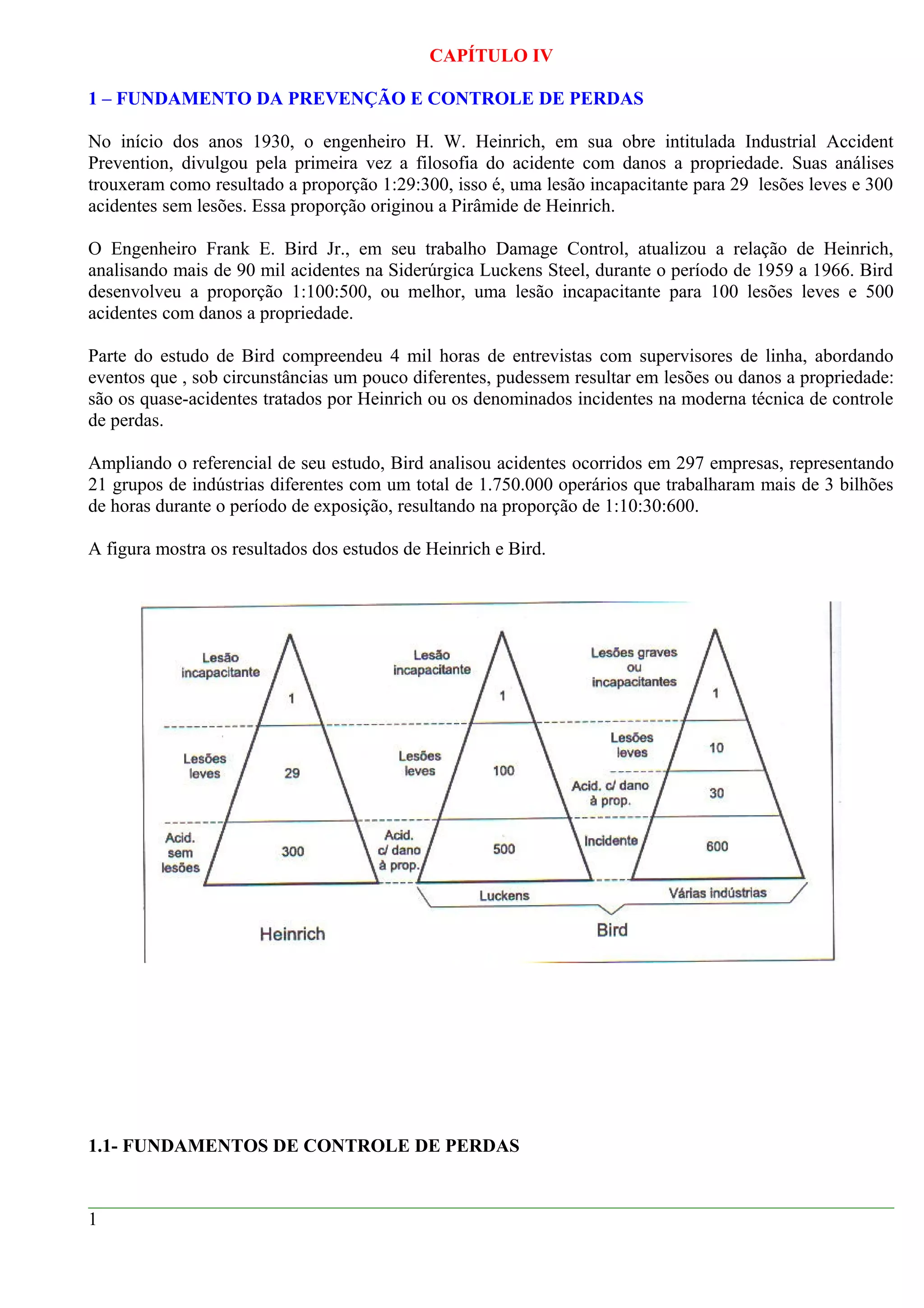 1. O documento discute os fundamentos da prevenção e controle de perdas, incluindo as proporções de acidentes desenvolvidas por Heinrich e Bird.