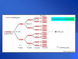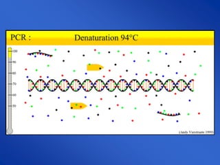 A reação em cadeia da polimerase (PCR) permite a amplificação in vitro de uma sequência específica de DNA através de replicação repetida. A PCR tem aplicações no diagnóstico de doenças, clonagem de genes, determinação de variabilidade genética e outros. O processo envolve extração de DNA, delineamento de primers, reação de PCR e análise dos resultados.