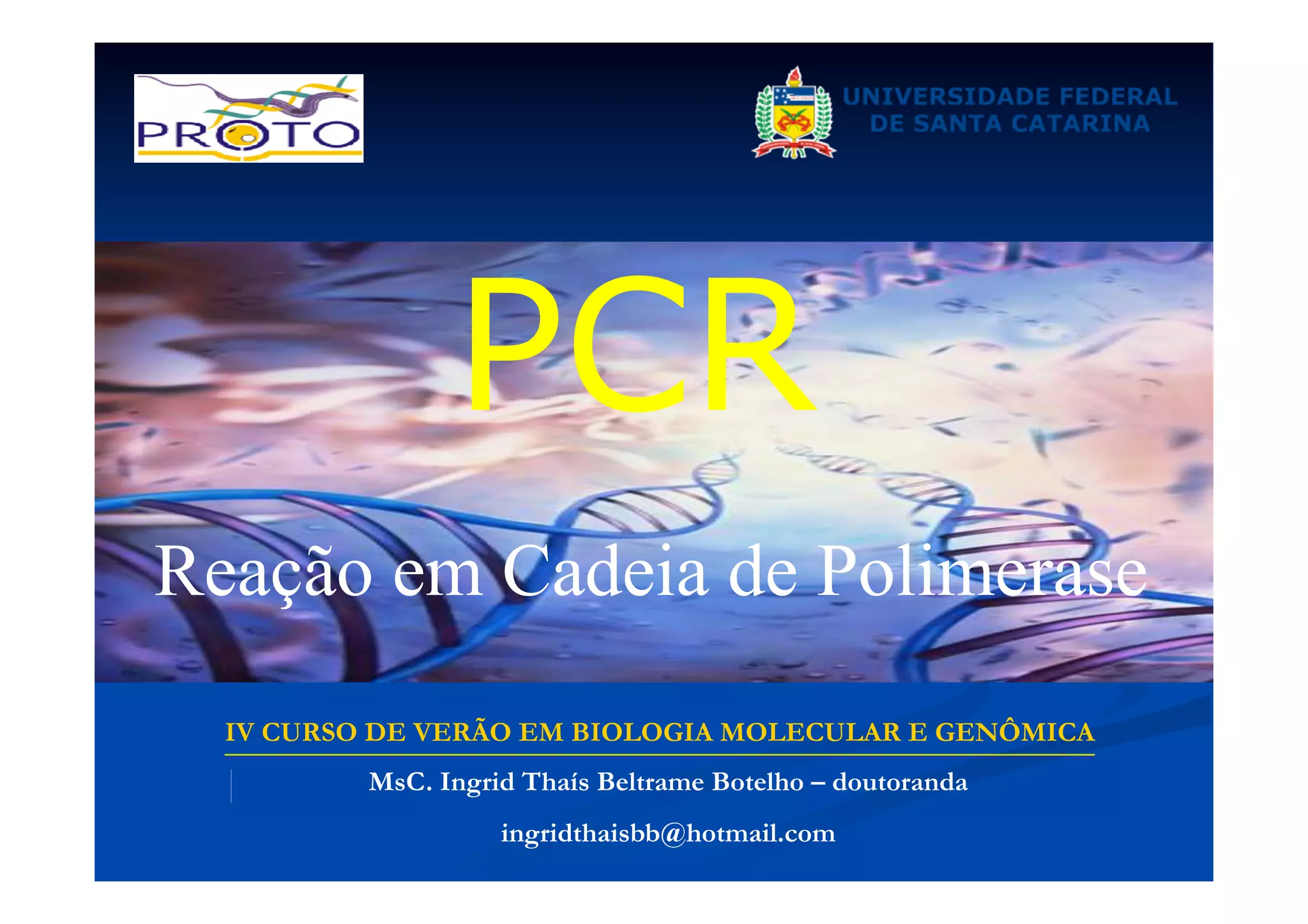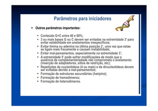 Este documento descreve a reação em cadeia da polimerase (PCR), incluindo seus reagentes, etapas e aplicações. A PCR permite a amplificação seletiva de segmentos específicos de DNA e foi inventada por Kary Mullis em 1983, revolucionando a biologia molecular.