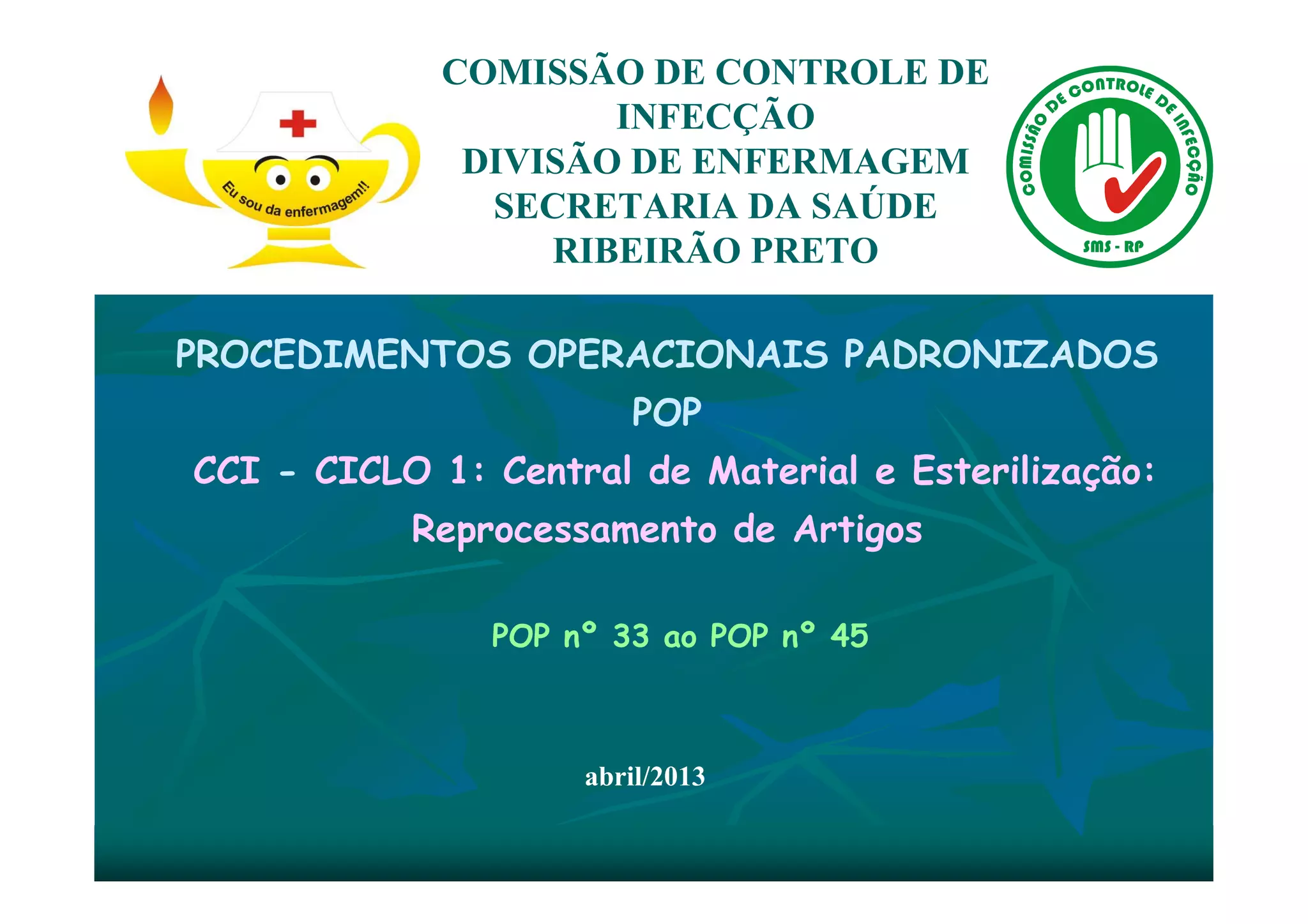 O documento descreve os procedimentos operacionais padronizados (POPs) relacionados ao reprocessamento de artigos na Central de Material e Esterilização (CME). Apresenta informações sobre pré-lavagem, limpeza, desinfecção, preparo para esterilização e armazenamento de instrumentais cirúrgicos e outros artigos, de acordo com sua classificação como não críticos, semicríticos ou críticos. Também descreve a estrutura física e os processos realizados na CME.